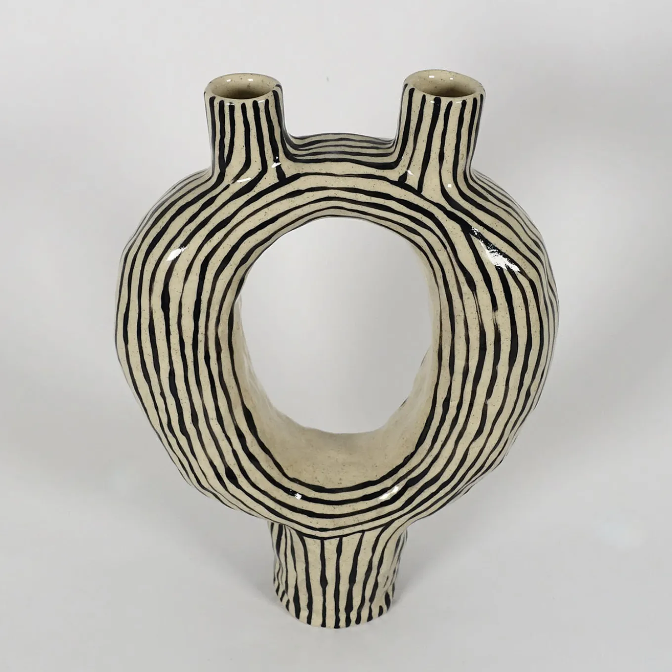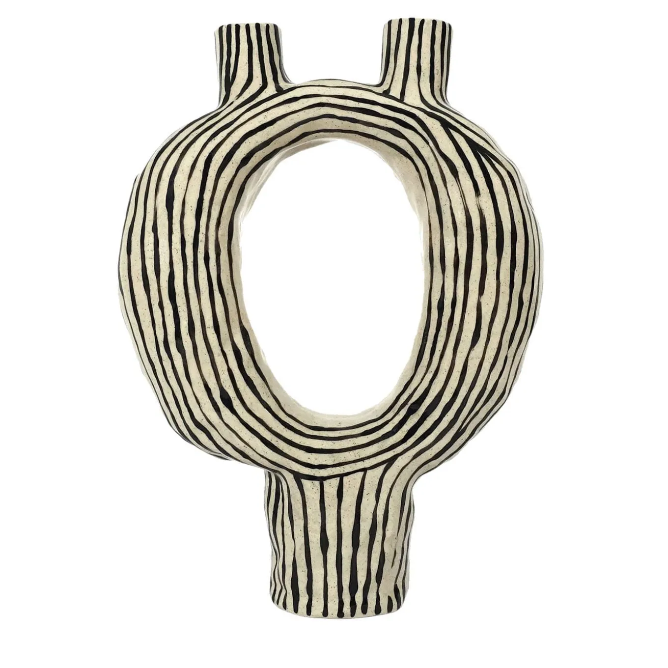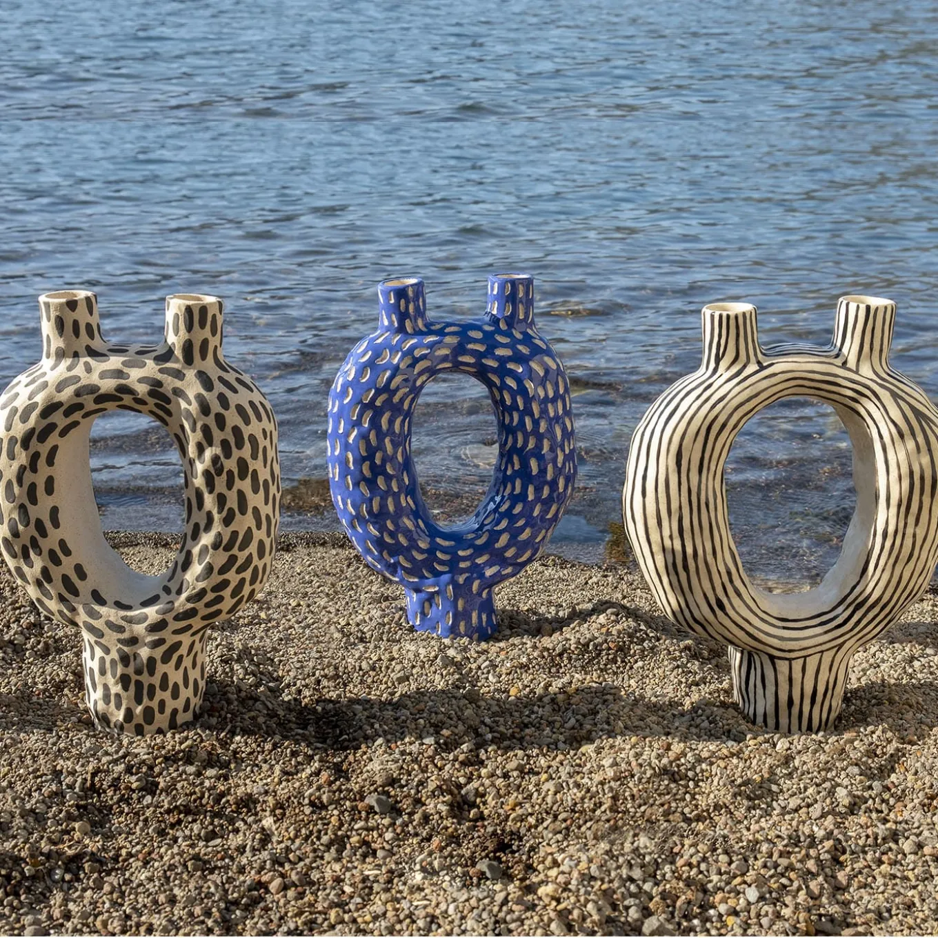 Named after the Italian words for “alien candle holder”, this one-off design recalls ancient bonds, of what’s unknown yet familiar. Deftly crafted by hand of porcelain stoneware spotted with blue dots, it is decorated with black-lacquered stripes enhanced with a polished finish. Due to its handcrafted nature, this candle holder may display small imperfections that are a testament to its uniqueness and to the authenticity of the material.