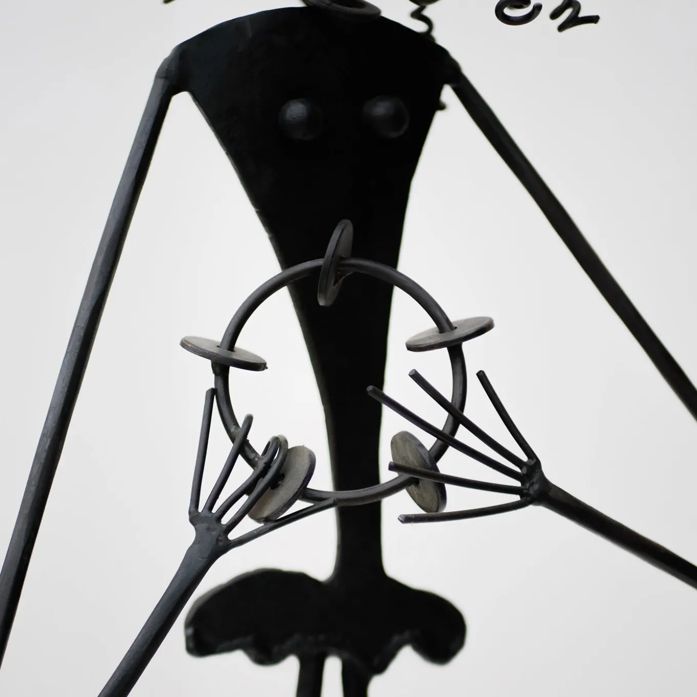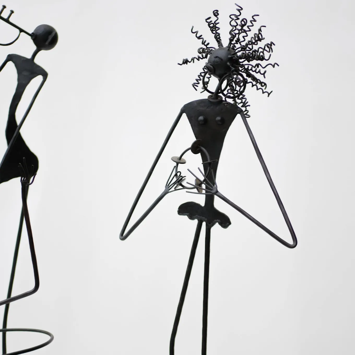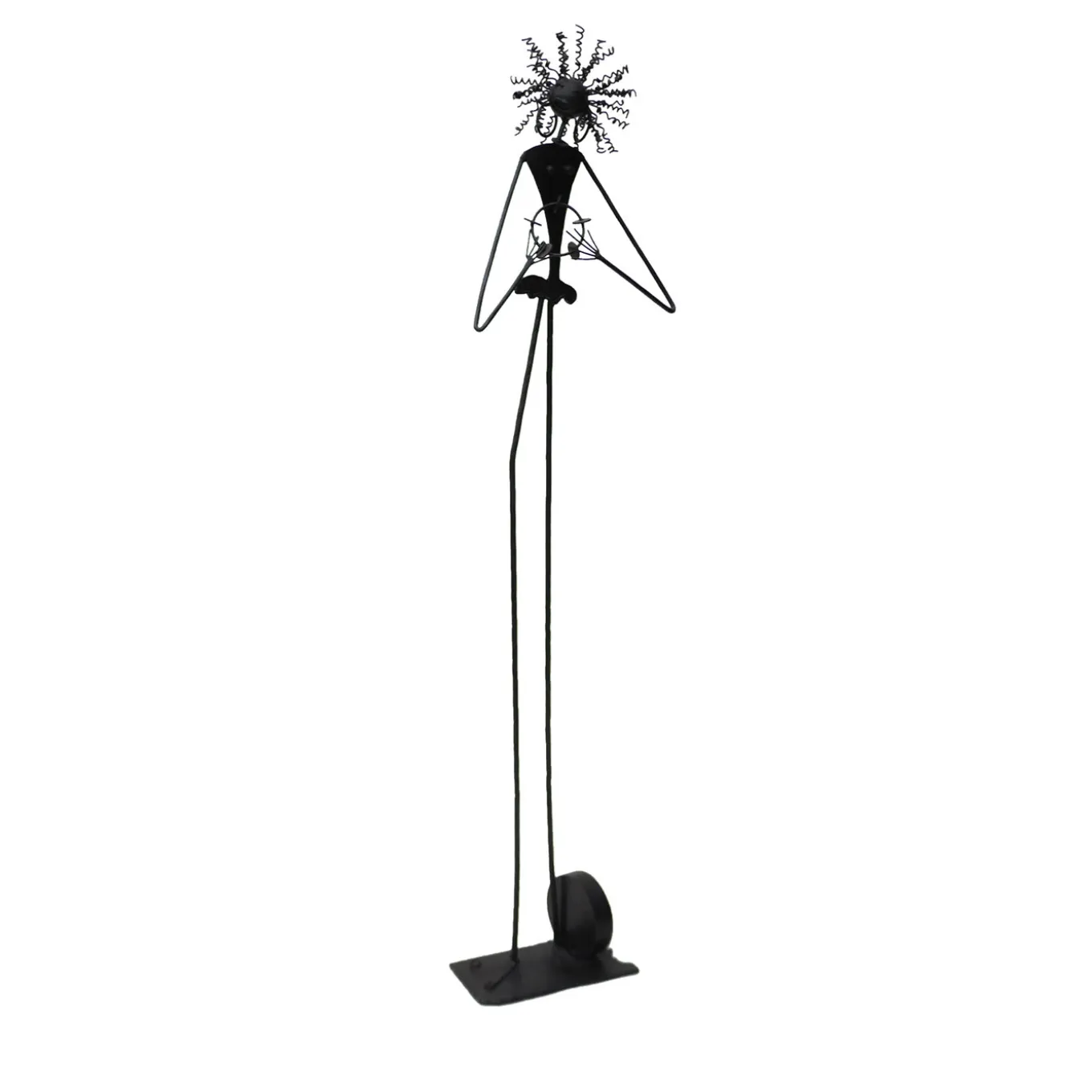 This precious, anthropomorphic sculpture minutely handcrafted from wrought iron depicts a stylized Afro-American female singer while performing one of her songs aided by a small musical instrument with bells. The disproportionate and dramatic components of her body are representative of her talent and cheerful character, arising subtle amusement in the observer. The burnished finished and the application of oil as final touch seal the design, spot-on gift for ethnic-style interiors.