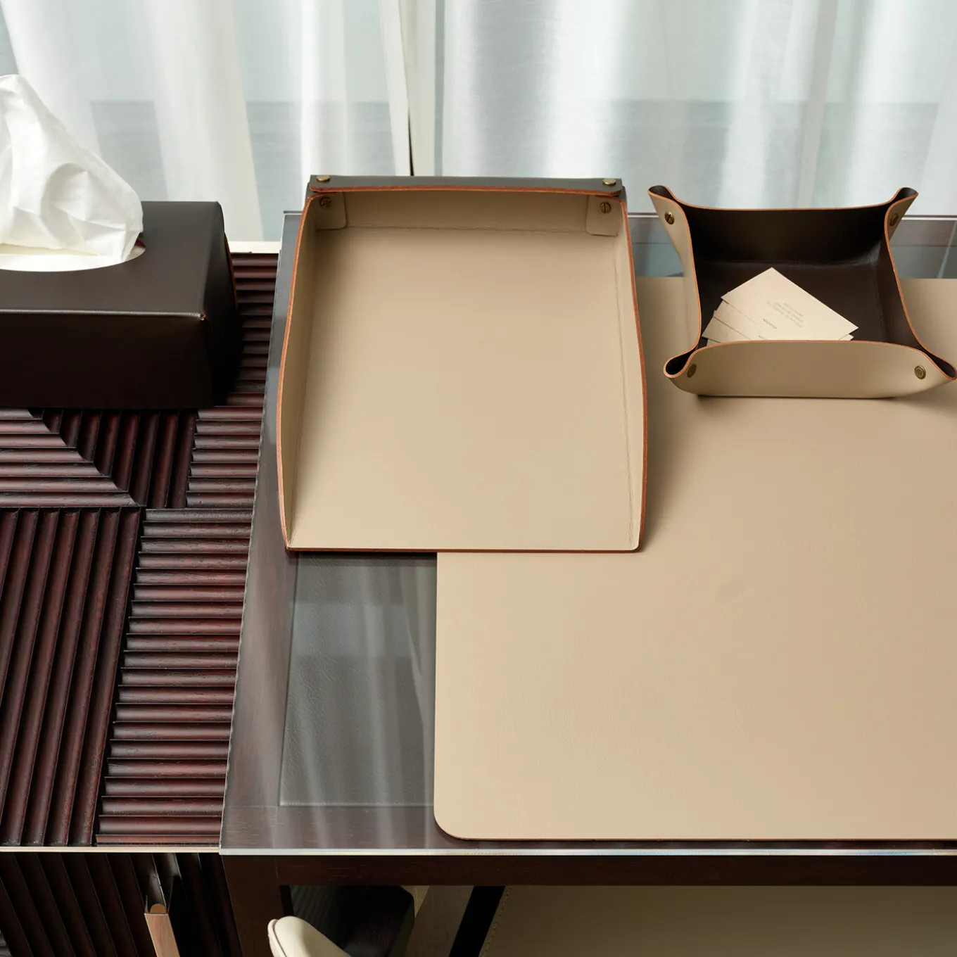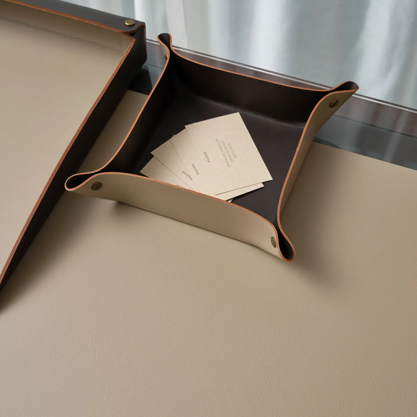 A practical and functional vide poche designed to keep small items like paper clips, coins, and keys organized and within reach on your desk. This piece features a cappuccino exterior with a contrasting chocolate interior, secured at the corners by snaps that add a subtle detail to its clean lines. Designed by Ekaterina Borovkova, it balances style and utility for everyday convenience.