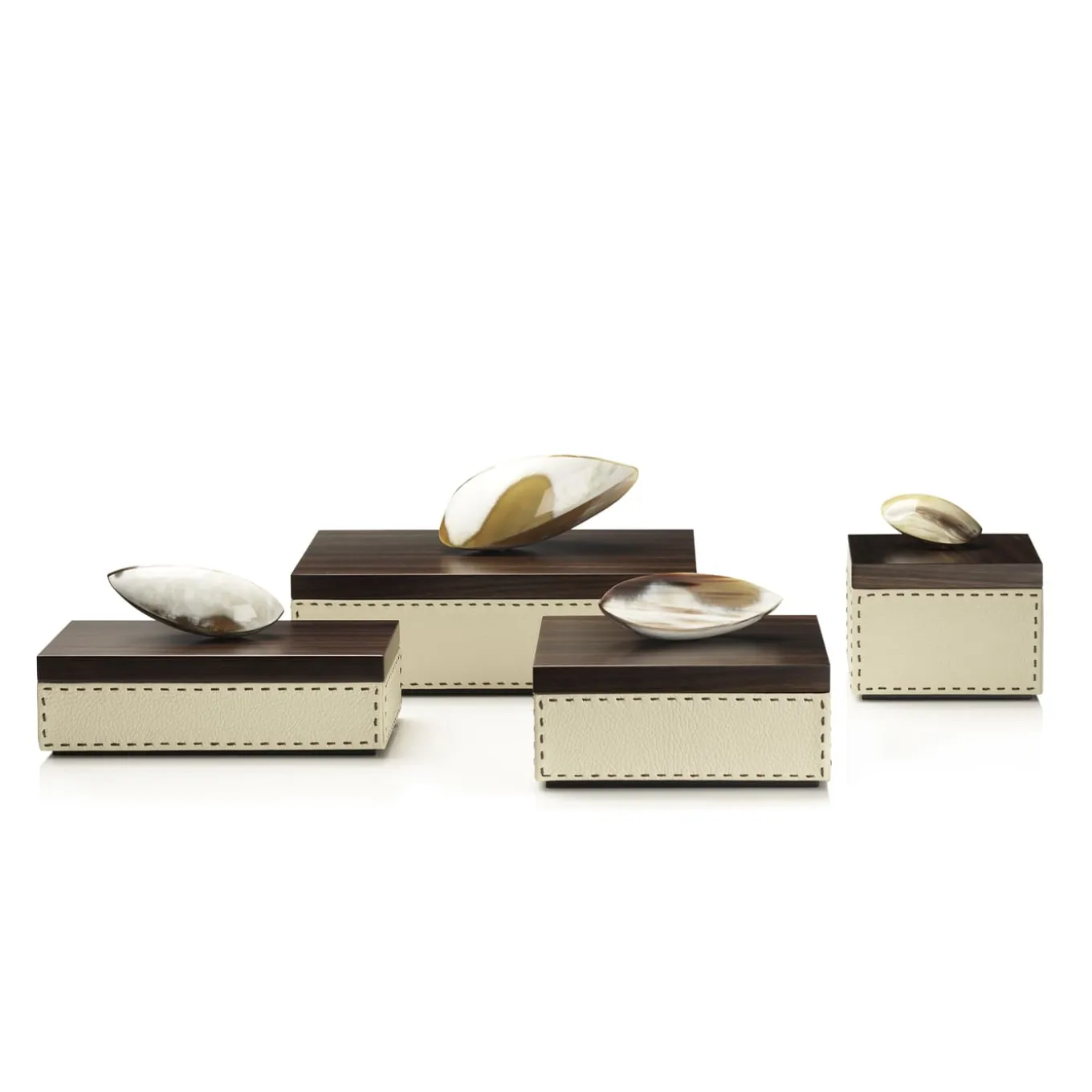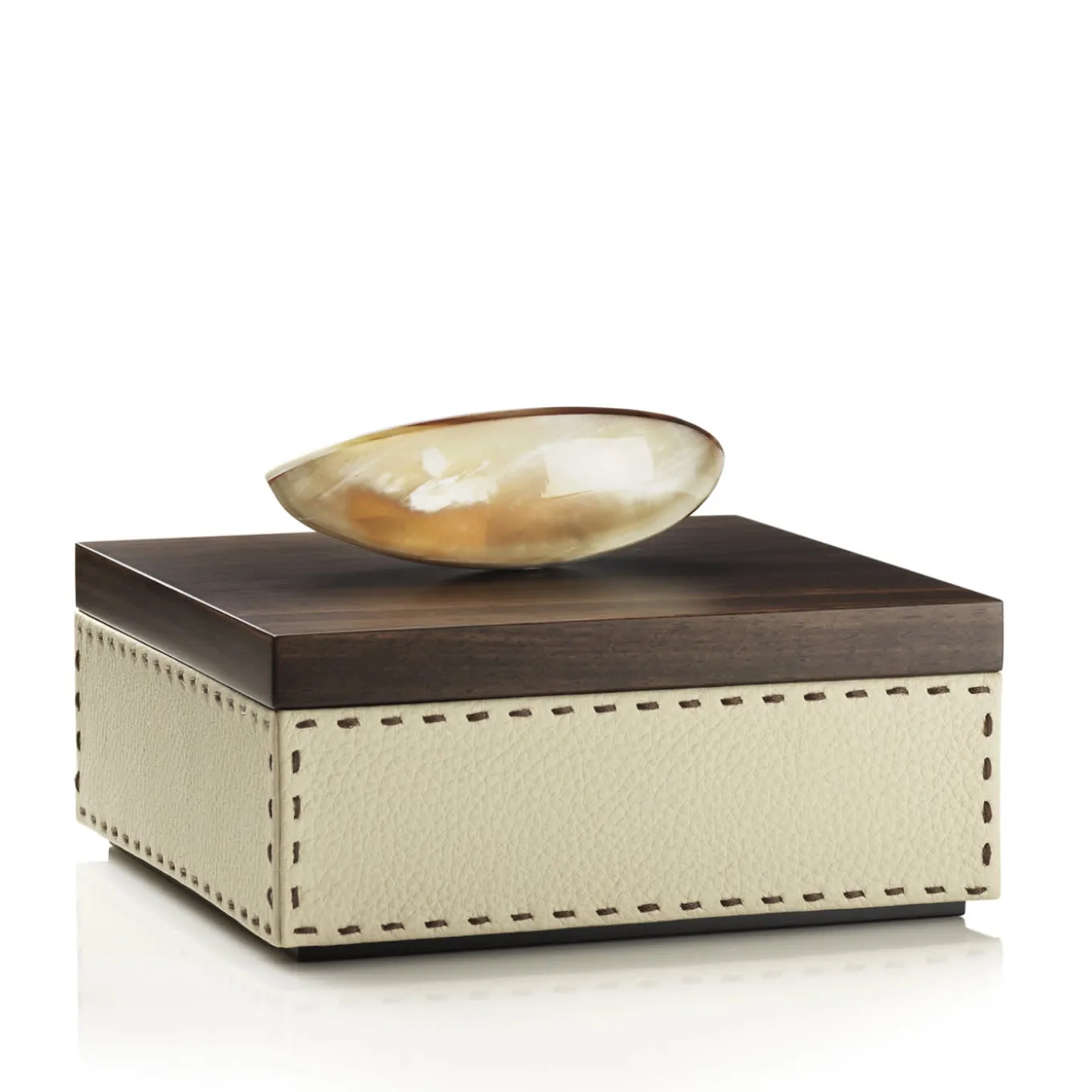 Square box in Aida pebbled leather, Ice-cream color with handmade dark brown stitching. Lid in matte Amara ebony veneer with a sculptural horn handle. Please, contact the Concierge for further information.