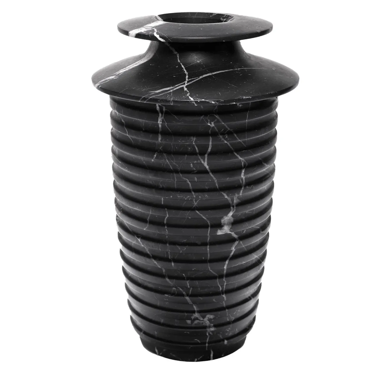 A dynamic silhouette in prized black Marquina marble marked by a grooved texture defines this exquisite vase, whose profile dramatically narrows to shape the sinuous and rounded lines tracing its neck. Subtle white veins only interrupt the deep black of the marble, their skyward orientation seemingly evoking a faraway inspiration that unexpectedly couples Greek and Roman amphoras with Renaissance sculpture tradition. This elegant piece is ideal for displaying colorful floral arrangements Please note that marbles and stones are natural materials and they can differ also if coming from the same quarry or the same block. The product shown may differ from purchased items. Every piece is unique.