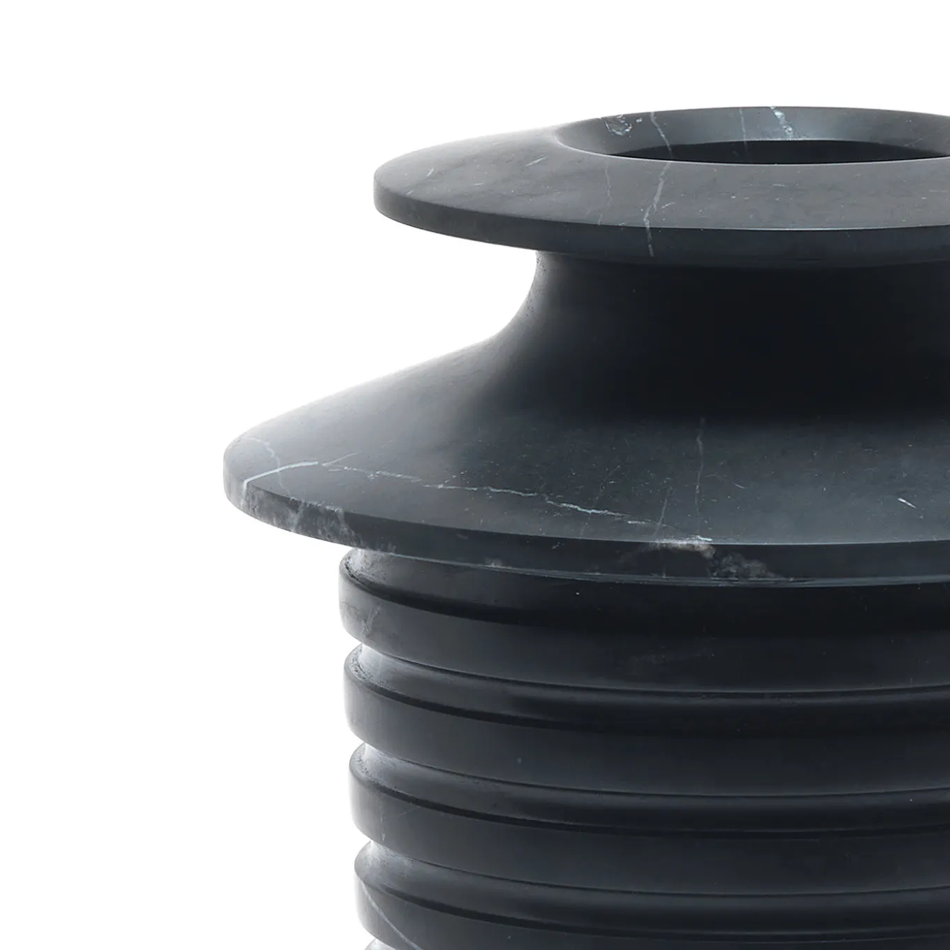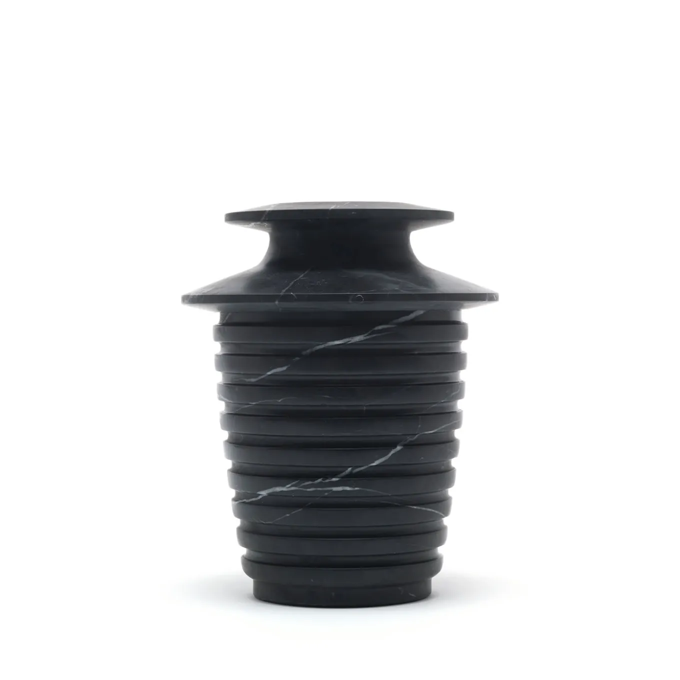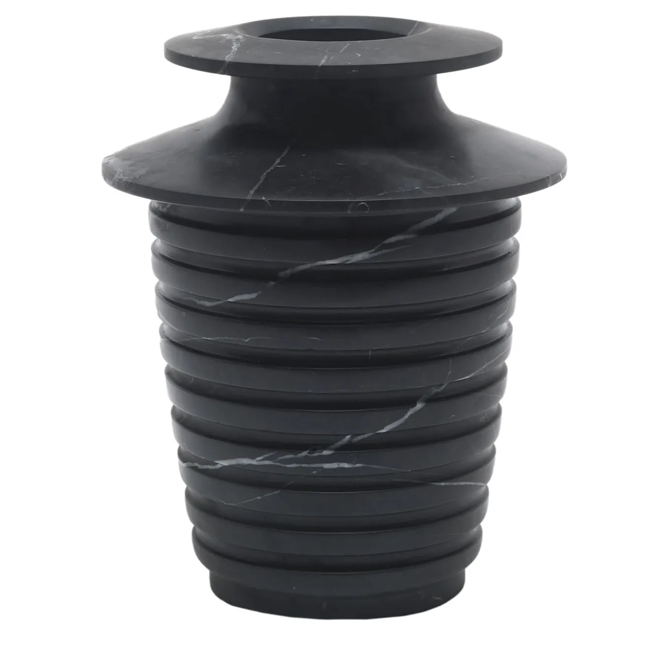 A refined piece of functional decor that couples historic inspiration with a distinctly modern soul. Crafted of prized black Marquina marble distinguished by subtle, light veins, this vase boasts a sinuous profile inspired by Greek and Roman traditional vases and by Renaissance sculpting culture. The channeled texture of the vase guides the eye up to the top of the vase, where the neck is defined by a dramatic narrowing of the piece’s profile that adds dynamism to its silhouette. Please note that marbles and stones are natural materials and they can differ also if coming from the same quarry or the same block. The product shown may differ from purchased items. Every piece is unique.