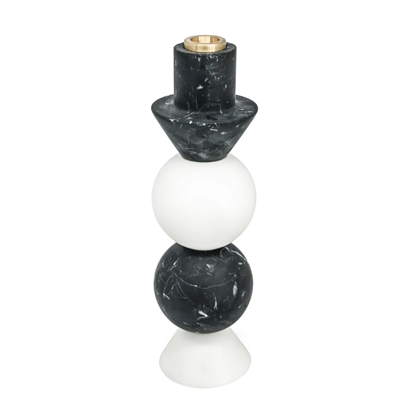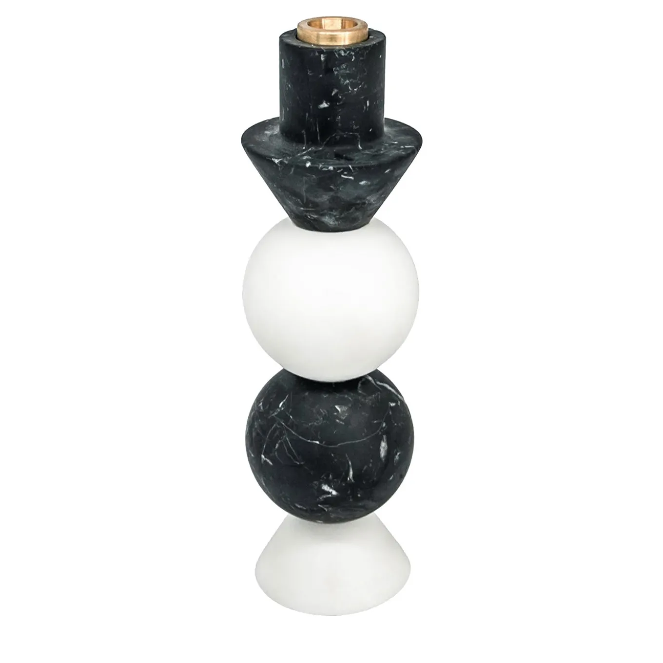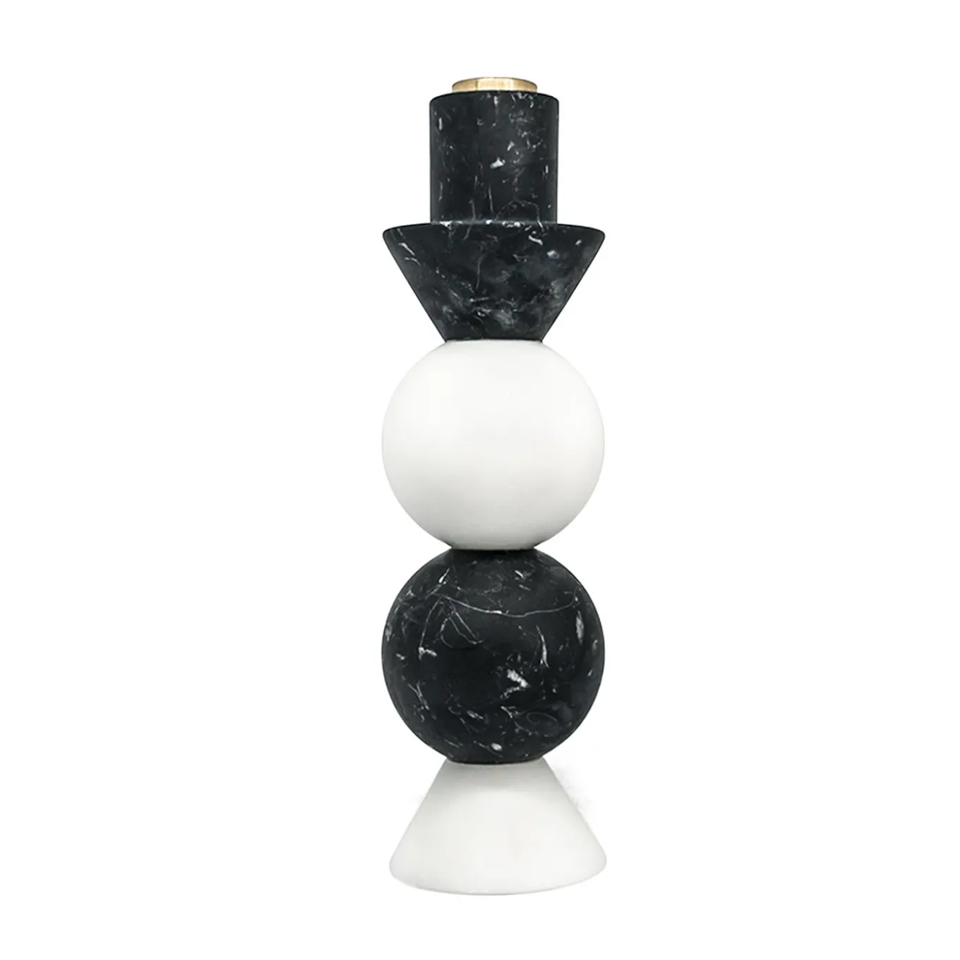 This striking candlestick holder features a tiered silhouette of alternating, geometrically shaped layers of White Carrara and black Nero Marquina marble. Its top is trimmed in brass. This item is the perfect accent for the home, an elegant gift or sophisticated wedding decoration. Hand-produced by skilled Italian craftsmen who have been trained in traditional techniques.