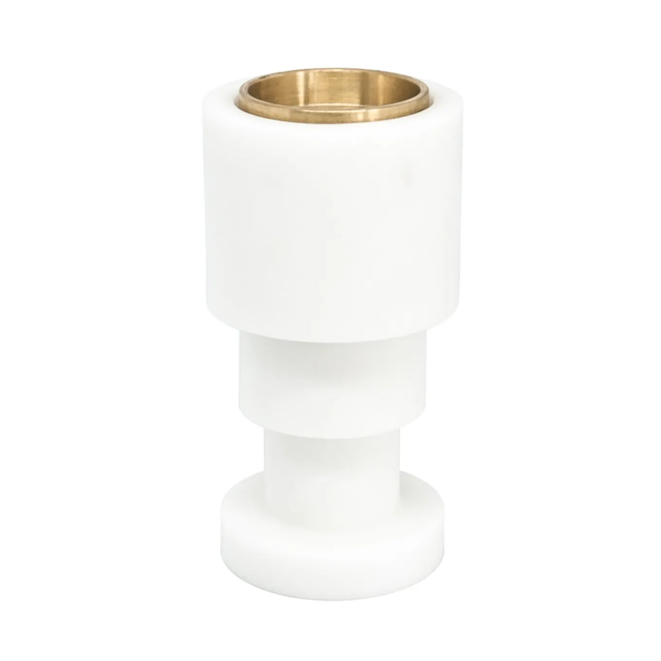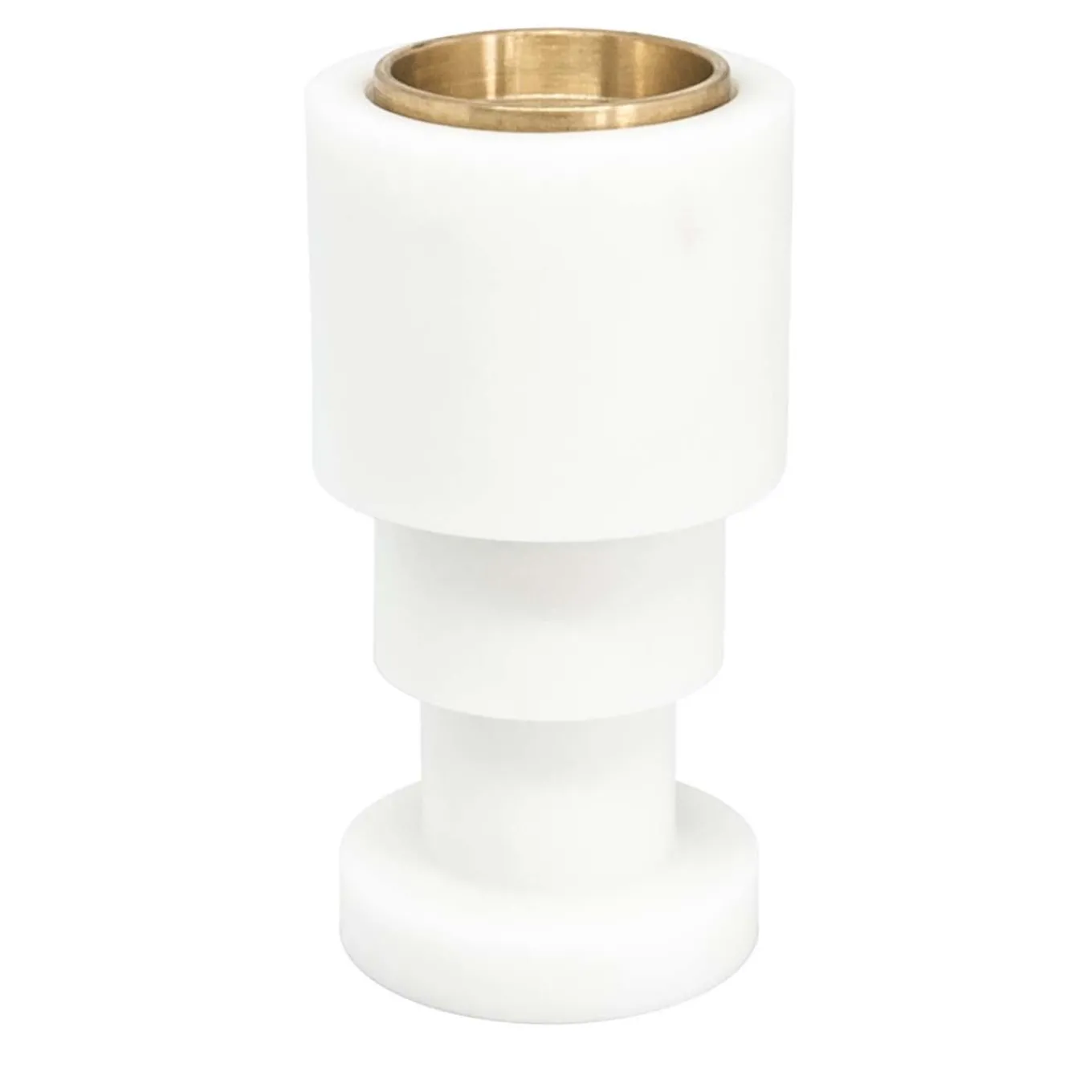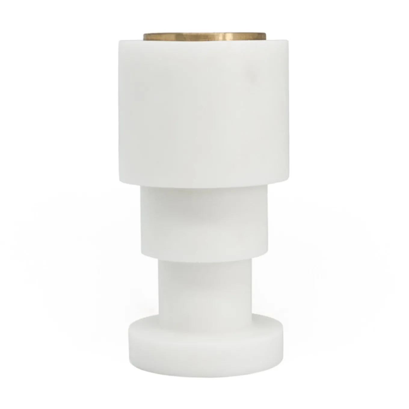 This low candleholder features a visually striking, minimalist, tiered silhouette which is accented by bronze trim. Made from White Carrara marble, whose uniquely veined surface guarantees that each item will be a true original. Hand-crafted by expert Italian artisans using traditional techniques that have been handed down generation to generation.