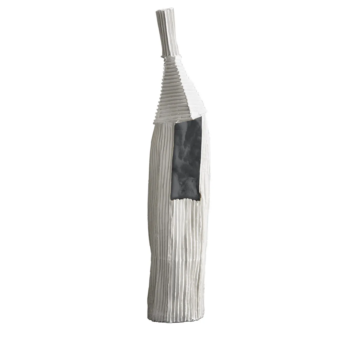 The seemingly simple form of this sculpture evokes conflicting sensations: sinuous and linear, stable and precarious. This handmade bottle boasts a minimal design with a slender, cylindrical body and detailed vertical ridges that add depth and movement to the piece. A black rectangle with a smooth finish is placed below the faceted, asymmetrical neck, accented with horizontal lines. Entirely handcrafted of paper clay, this object will bring an elegant accent in any space in the home or office. Every one of Paola Paronetto’s creations is unique. Slight variations in shape, colour and size are to be considered a guarantee of authenticity and value. They are finished with non-toxic satin-finish enamels. Although very rarely, it is possible for them to leak after long periods of exposure to water. It is therefore advisable to test their water resistance before using them on delicate surfaces. They should not be used as dining utensils. The white pieces can be washed with water or sanitizing products, whereas the coloured pieces must be treated more gently and cleaned with a feather duster or a soft cloth, dry or moistened very slightly with water.