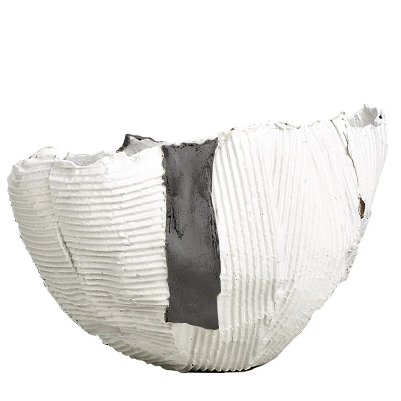 Entirely handmade of paper clay (mixture of paper pulp and clay), this precious bowl is a delicate yet striking accent for a modern living room or private study decor. The bold, balloon-like silhouette is marked by tall, sloping sides of irregular heights and accented by haphazardly drawn horizontal and vertical ridges. A smooth panel insert in gray strikingly contrasts in both color and texture, creating a visually dynamic piece that changes character from every perspective. Every one of Paola Paronetto’s creations is unique. Slight variations in shape, colour and size are to be considered a guarantee of authenticity and value. They are finished with non-toxic satin-finish enamels. Although very rarely, it is possible for them to leak after long periods of exposure to water. It is therefore advisable to test their water resistance before using them on delicate surfaces. They should not be used as dining utensils. The white pieces can be washed with water or sanitizing products, whereas the coloured pieces must be treated more gently and cleaned with a feather duster or a soft cloth, dry or moistened very slightly with water.