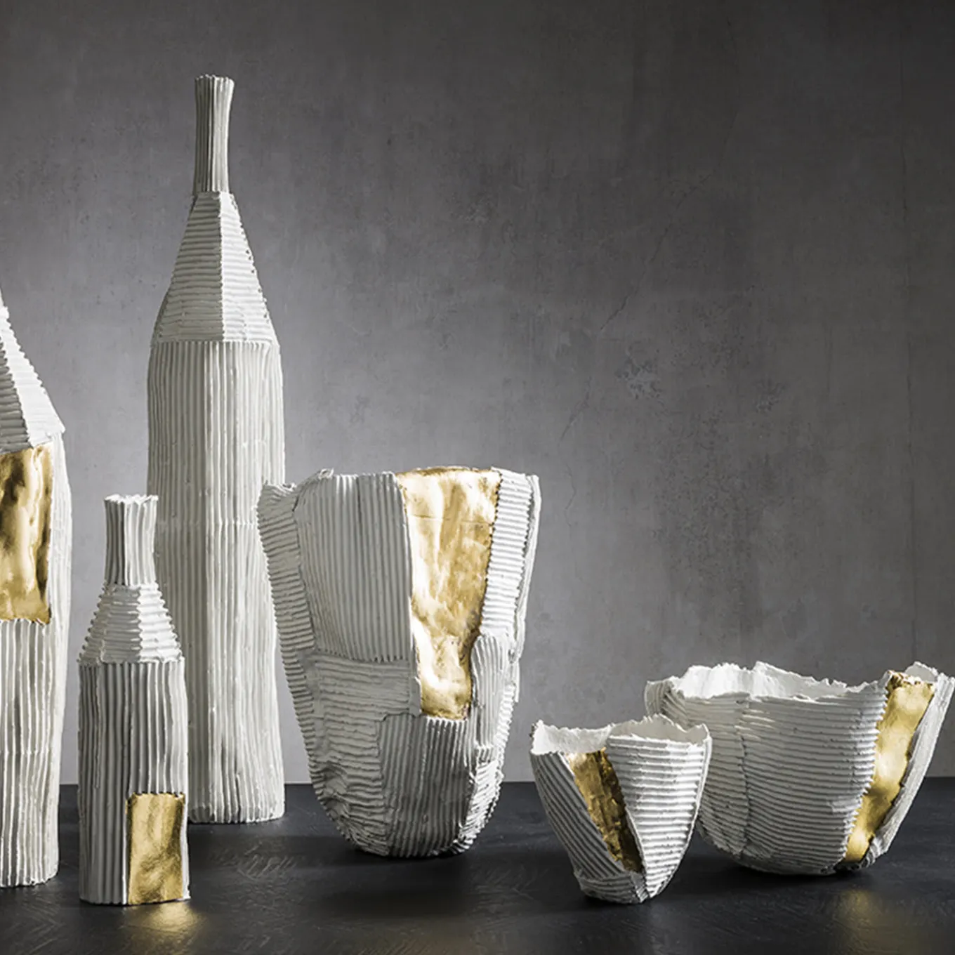 Striking and stately, this bowl features dynamic horizontal and vertical ridges and a distinctive panel insert in gold, whose vibrant color and smooth surface elegantly contrast with the expressive white for a striking visual impact. Taking on an irregular shape, this bowl is handmade of paper clay, an innovative material in which paper pulp and natural fibers are mixed into the clay to achieve a distinctive textural and aesthetic quality. Placed as a centerpiece on a table or console, this bowl will enliven any decor. Every one of Paola Paronetto’s creations is unique. Slight variations in shape, colour and size are to be considered a guarantee of authenticity and value. They are finished with non-toxic satin-finish enamels. Although very rarely, it is possible for them to leak after long periods of exposure to water. It is therefore advisable to test their water resistance before using them on delicate surfaces. They should not be used as dining utensils. The white pieces can be washed with water or sanitizing products, whereas the coloured pieces must be treated more gently and cleaned with a feather duster or a soft cloth, dry or moistened very slightly with water.