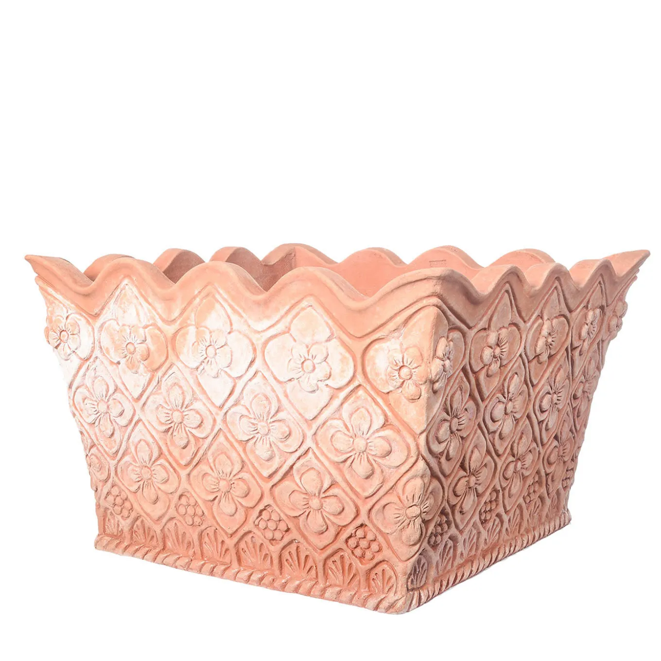 This exquisite planter is deftly handcrafted of a precious type of terracotta typical of Impruneta, a ceramic district near Florence renowned since medieval times. A delicate pattern of flowers frames the sides, the wavy upper rim adding textural appeal. Striking to accent terraces or indoor living areas, each piece features unique shades and details deriving from the artisan manufacturing process. CAT certified.