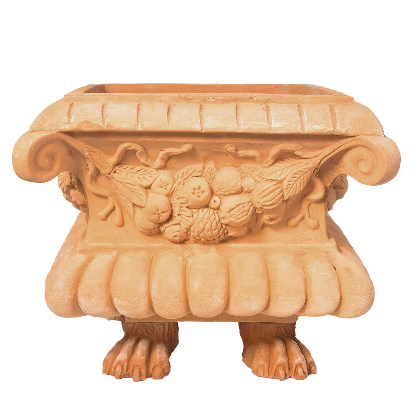This artful planter exemplifies the unparalleled quality of handcrafted terracotta pieces from the ceramic district of Impruneta, near Florence. A tridimensional, still-life garland adorns the sides, together with volutes and bold, channeled volumes. The pot is raised on two feet shaped like lion feet (“piedi di leone” in Italian) for an eccentric detail that is sure to bring character to any terrace or patio. CAT certified.