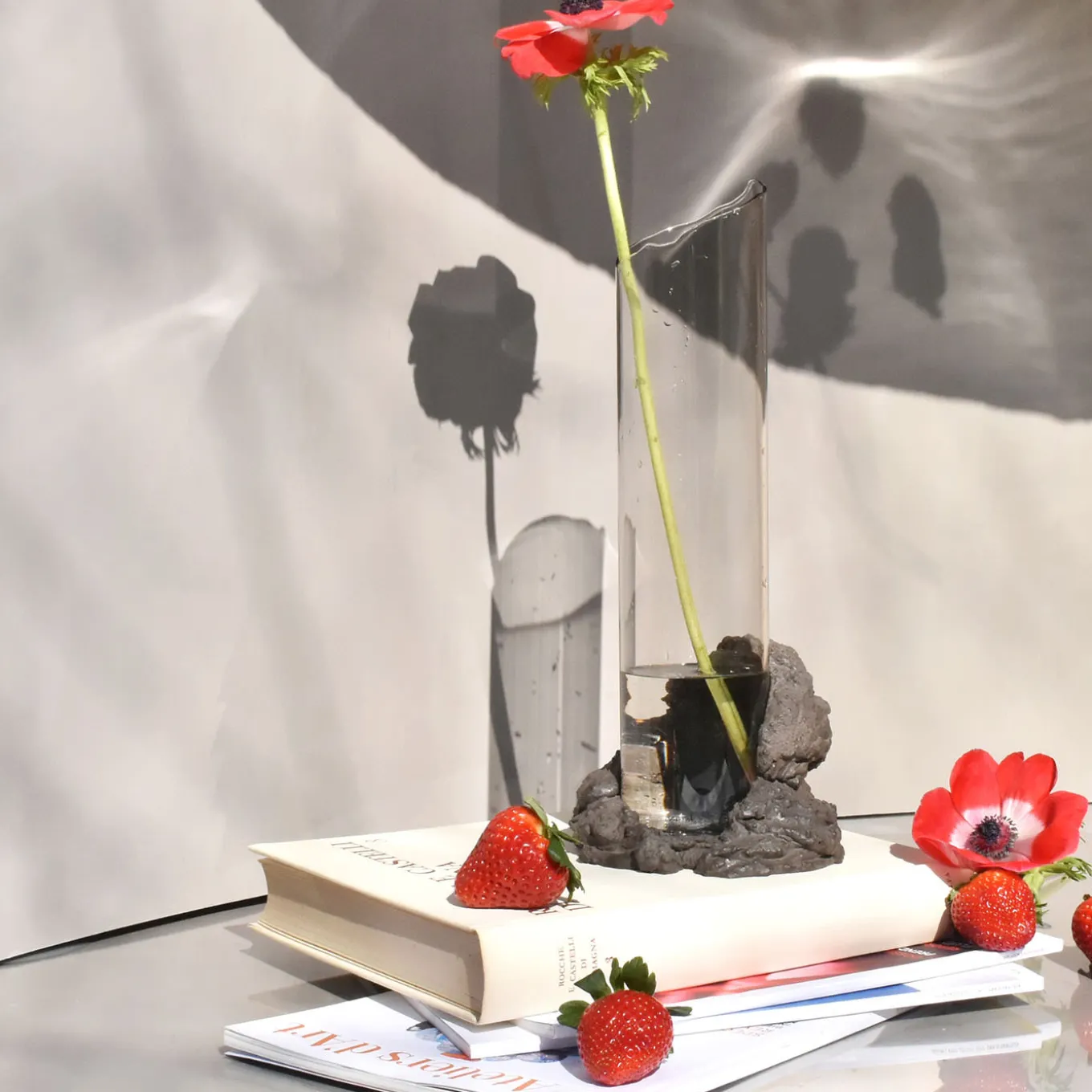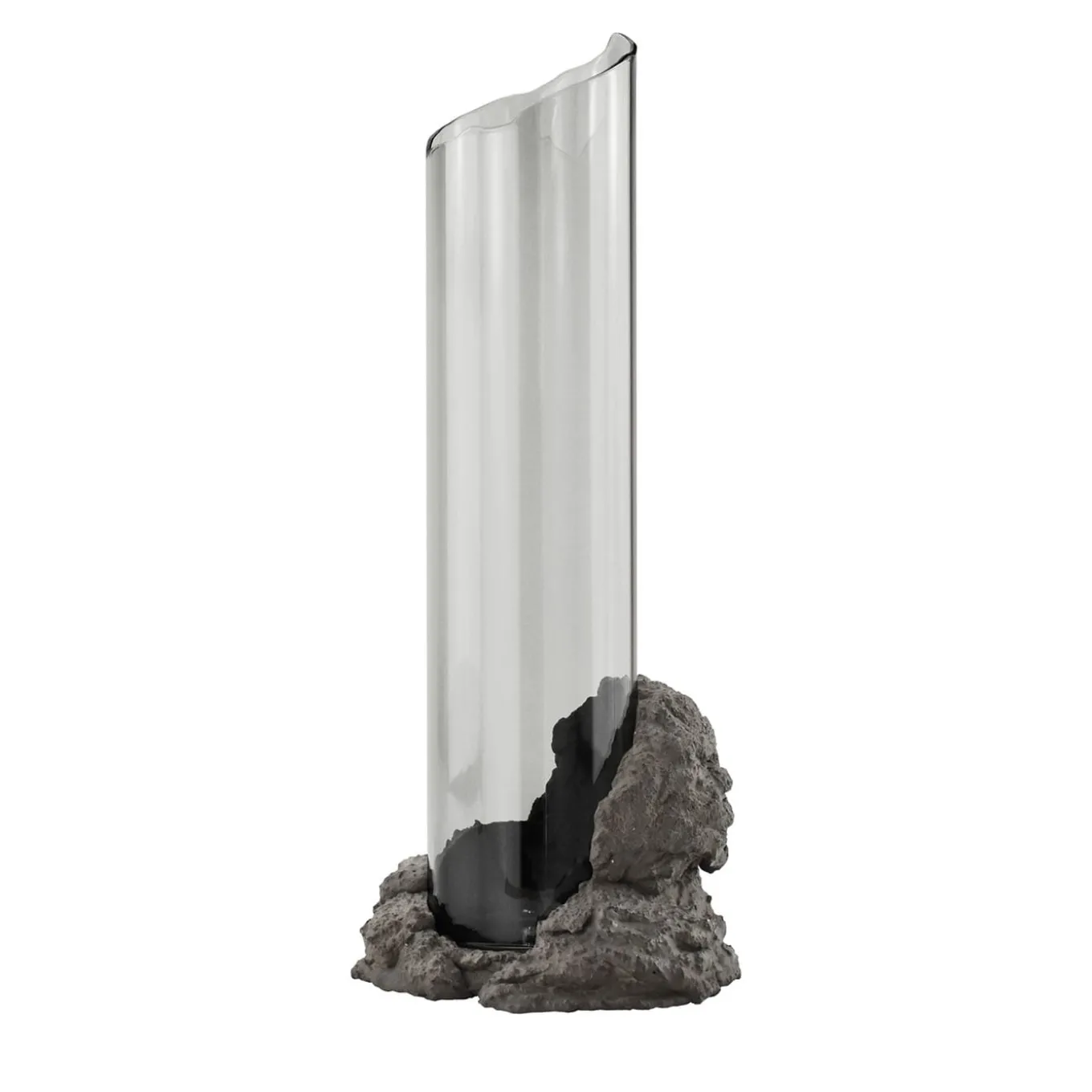 An evocative sculptural vase composed of two intersecting elements—glass shaped like flowing lava and textured stone formed from mineral fragments. The design features broken, sinuous lines symbolizing movement and transformation. Crafted using ancient techniques with natural materials free of industrial additives, it functions as both a flower vase and an independent art object, serving as a distinctive focal point in contemporary interiors. Slight variations in shape may occur due to its handcrafted nature.