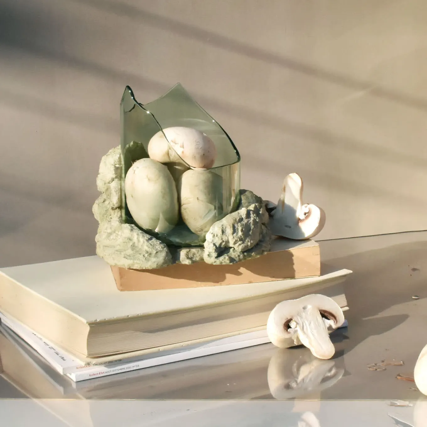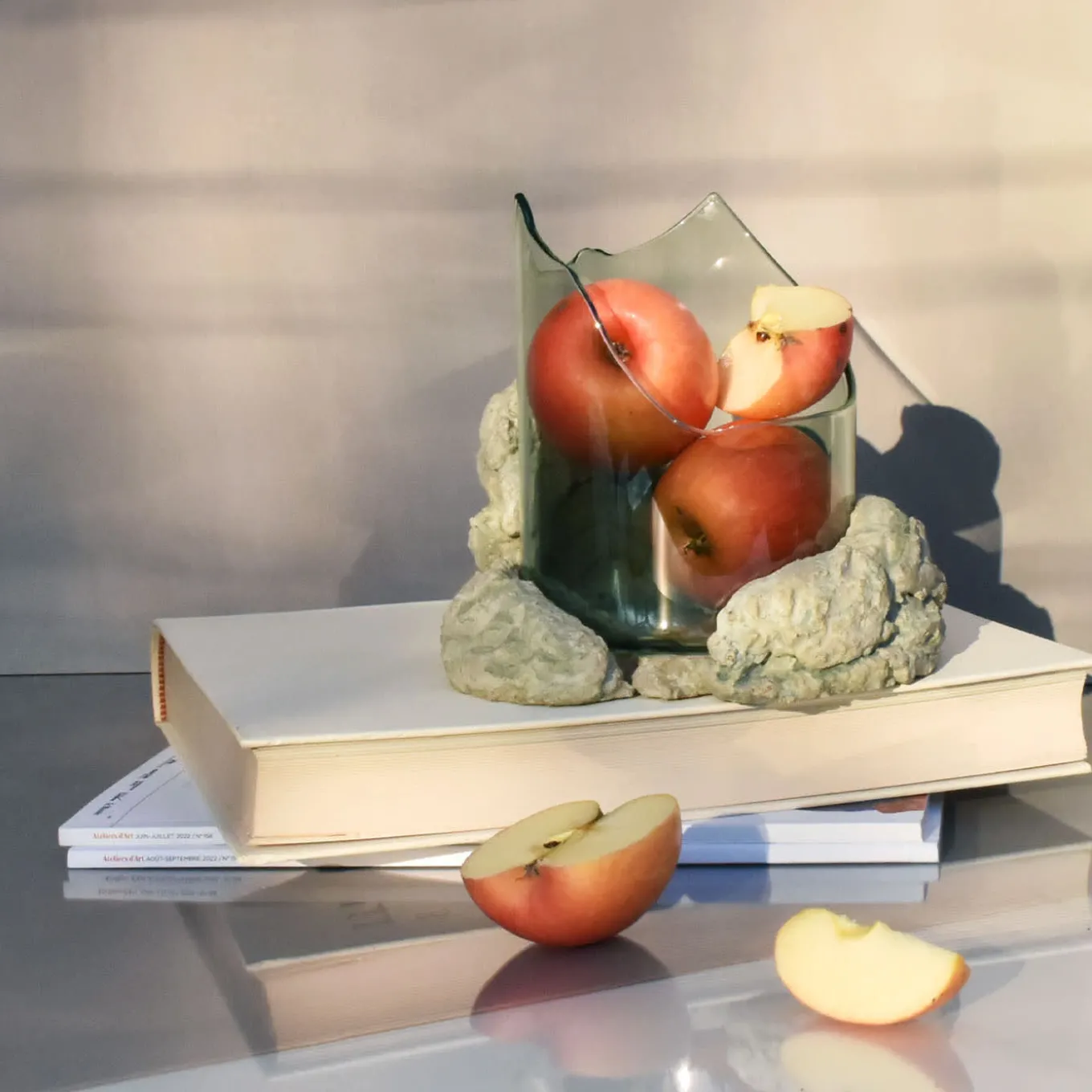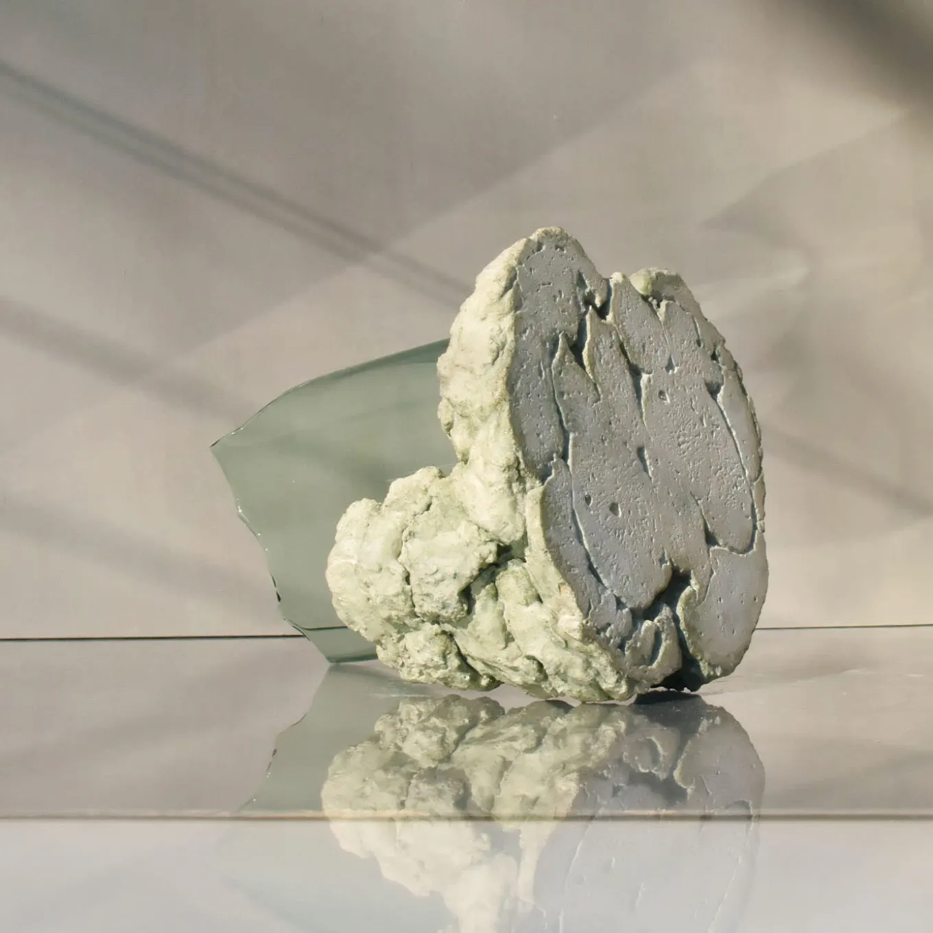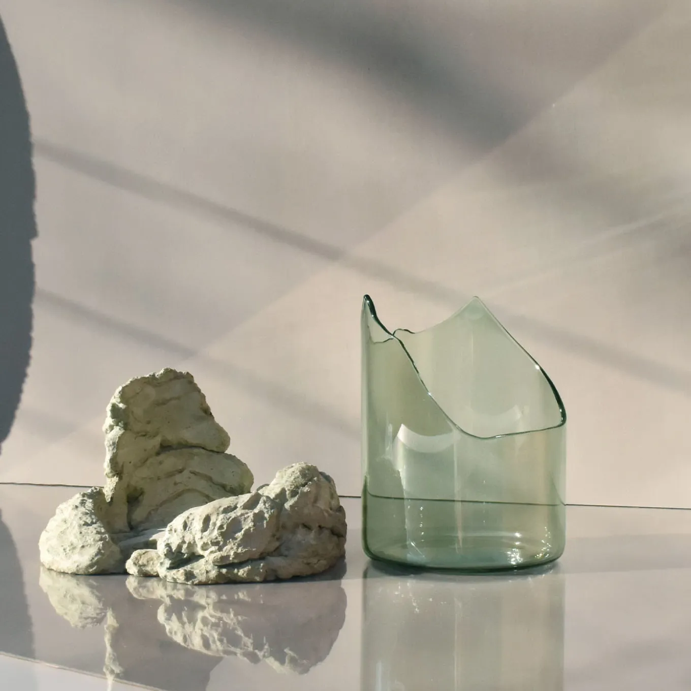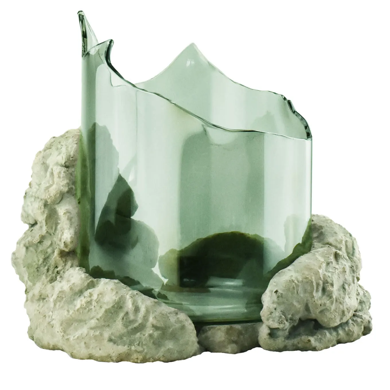 This sculptural bowl features an open, fractured form that blends expressive tension with a sense of containment. Crafted with flame-worked glass that mimics flowing lava before crystallization, it rests on a natural stone base formed from a mix of raw fragments and earth without synthetic binders. This medium-sized sculptural piece separates into two elements and suits use as a centerpiece, ritual container, or standalone art object that interacts with light. Slight variations in shape may occur due to its handcrafted nature.