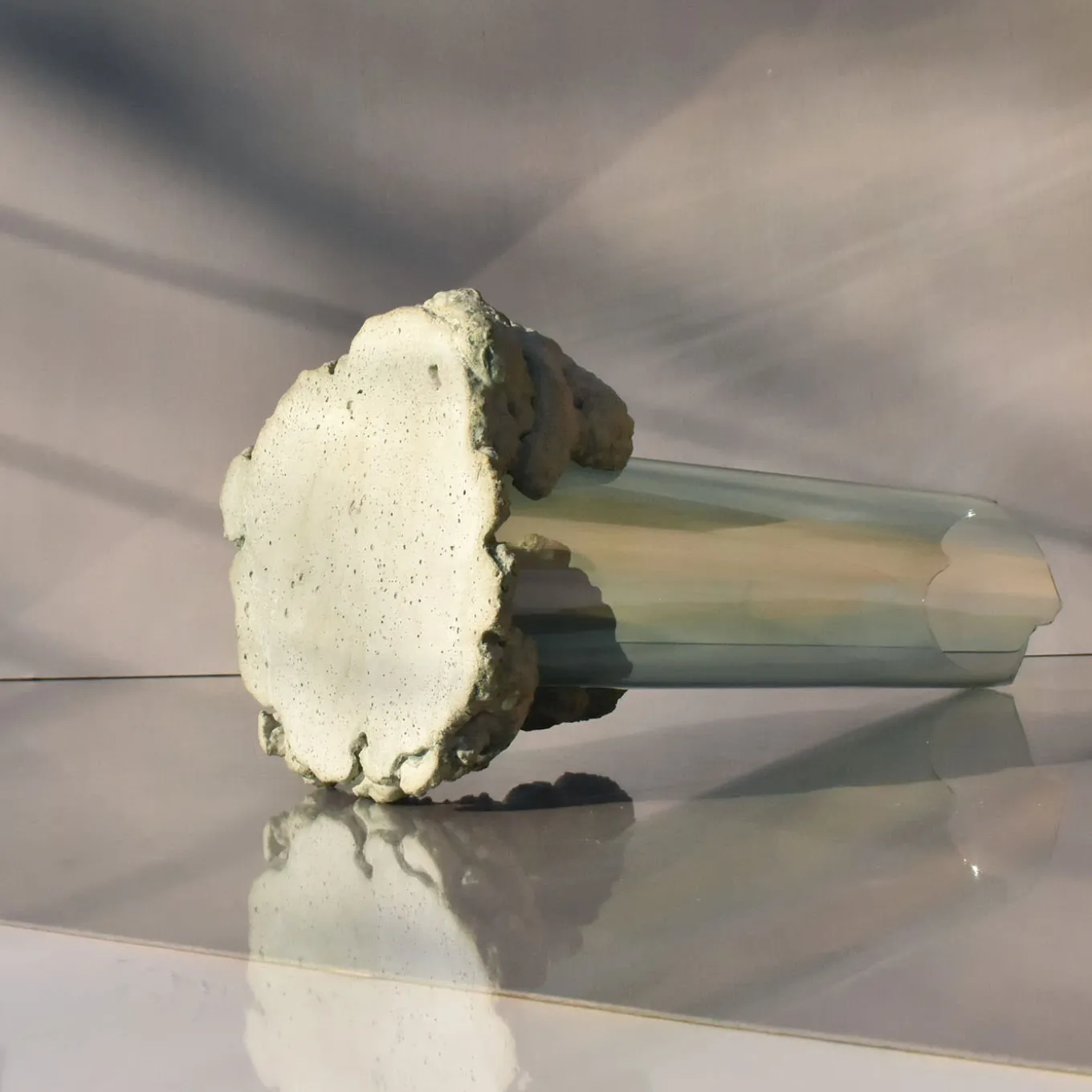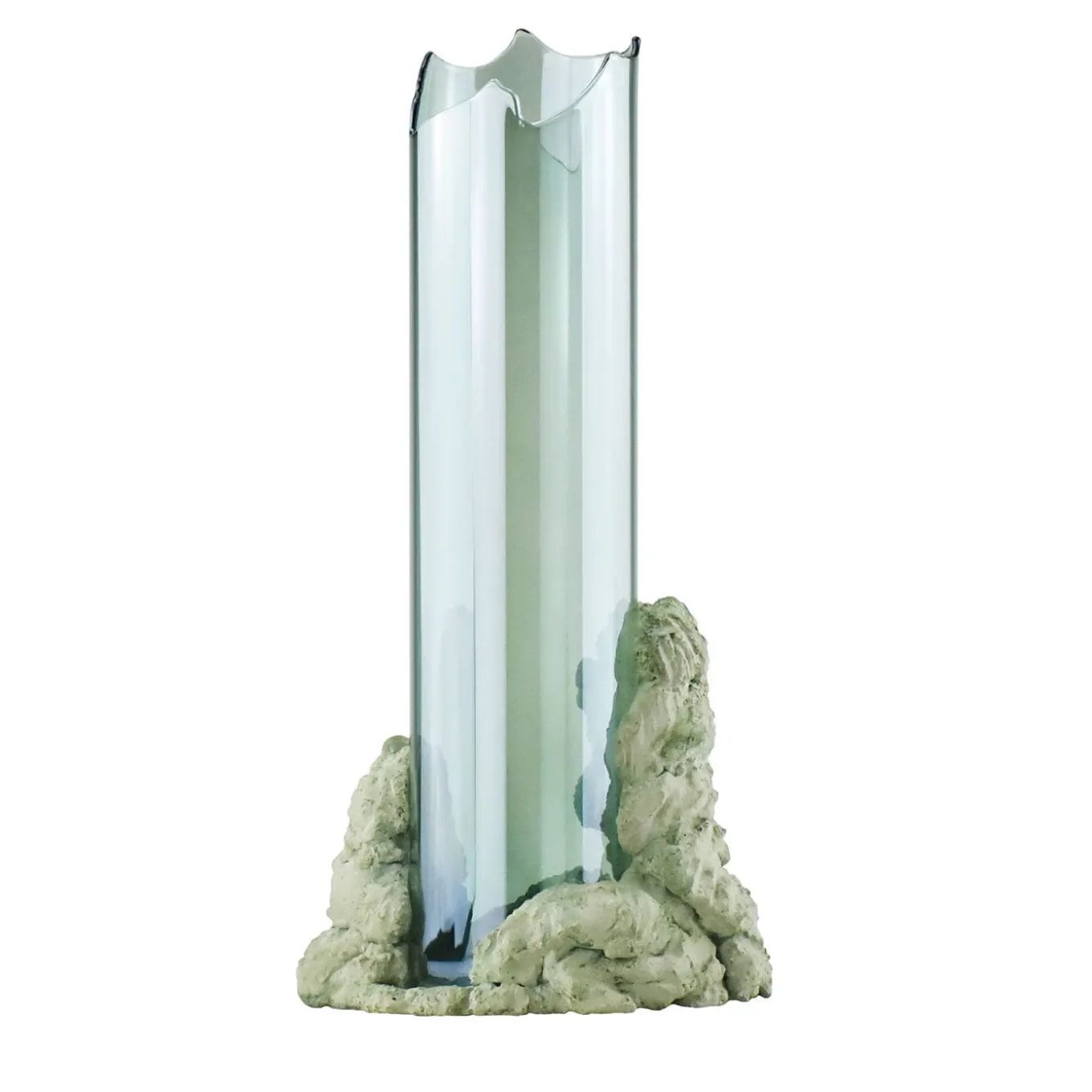 This sculptural vase embodies a journey through its broken, sinuous lines evoking movement and transformation. Composed of two intersecting elements without permanent joints, the design merges glass shaped like molten lava with textured mineral-based stone, inspired by ancient recipes without industrial adhesives. Suitable as both a vase or a standalone sculpture, it brings a tactile and symbolic focal point to any setting. Slight variations in shape may occur due to its handcrafted nature.