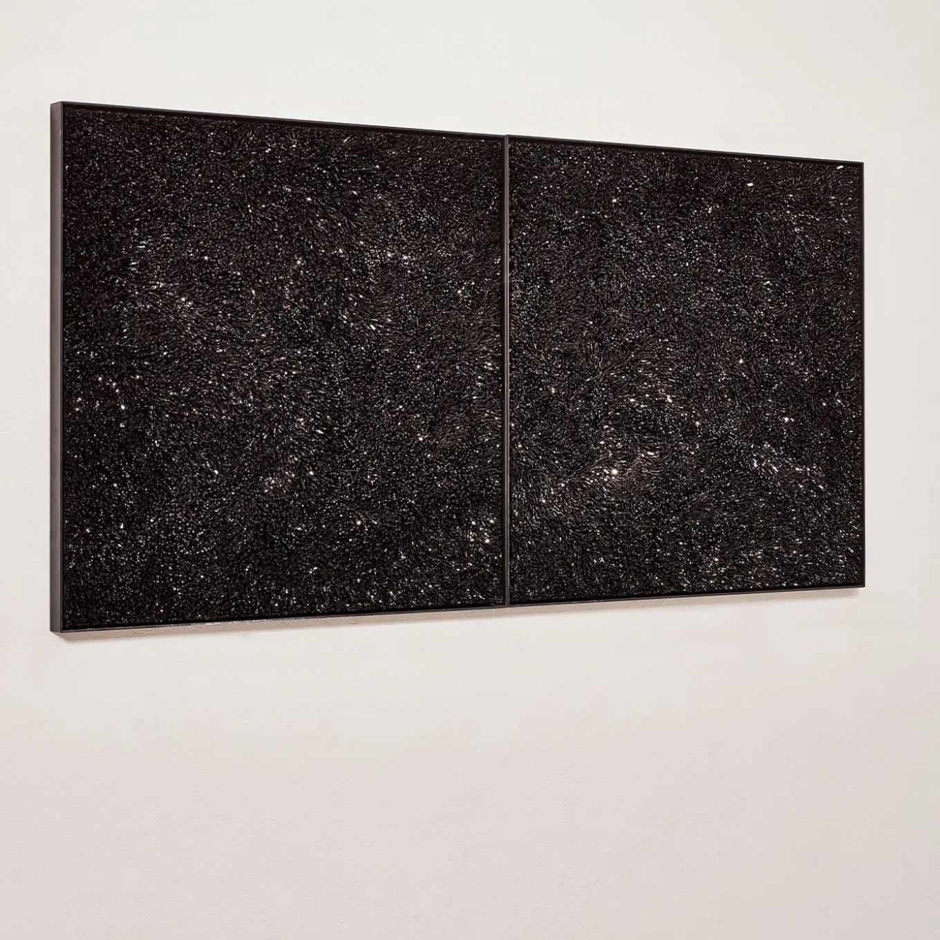 A pair of stunning pieces made from cathedral glass, colorant oxide, and mortar on multilayered wood and iron. Each piece measures 75 x 75 x 4 cm, showcasing a harmonious blend of materials and modern design. Ideal for adding a unique artistic touch to any space.