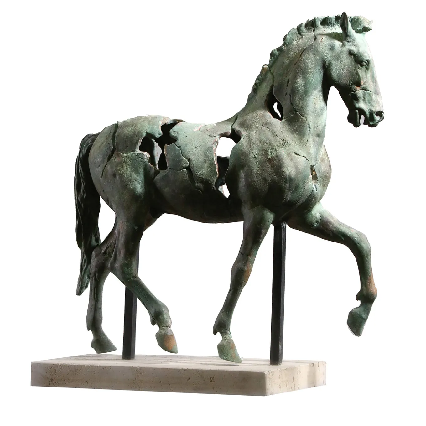 This bronze sculpture features a dynamic equestrian form realized through the lost-wax casting technique. It is finished with a distinctive fire-applied green patina that enhances its weathered, fragmented appearance. Elevated on a solid roman travertine marble base, this medium-sized decorative piece stands out as a striking example of sculptural art reminiscent of classical antiquity.