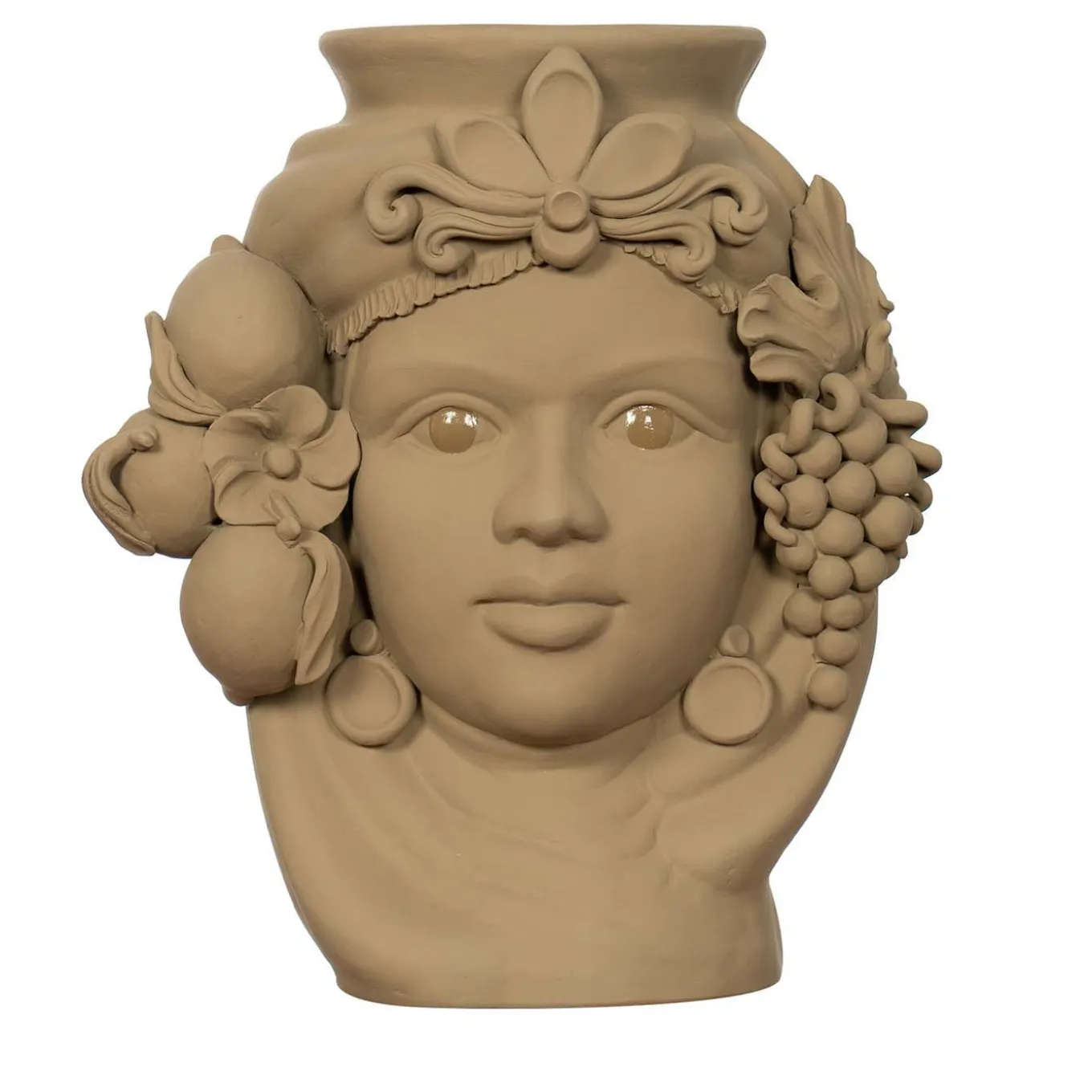 This superb vase is a stunningly modern interpretation of a Moor sculpture, a typical artifact of the Sicilian tradition. Exquisitely crafted by hand, the naturalistic features of a woman’s face are adorned with a crown, flowers, and fruit. It is finished with a striking matte white paint, while a vertical stripe in precious gold leaf adds an eye-catching accent. A splendid addition to an eclectic entryway console or contemporary living room, this piece will stand out in any room of the house. The vase cannot be filled with water.