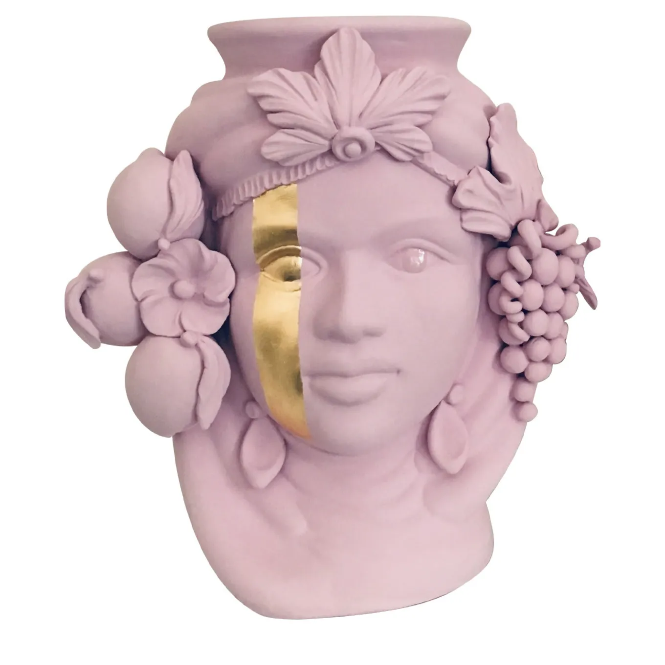 A modern interpretation of a traditional Sicilian Moor bust, this sculptural vase is exquisitely crafted by hand of pink-colored clay. The piece represents the soft and delicate features of a woman’s face adorned with flowers and fruit, and a vertical gold leaf enhancing the left side of the face. The vase cannot be filled with water.
