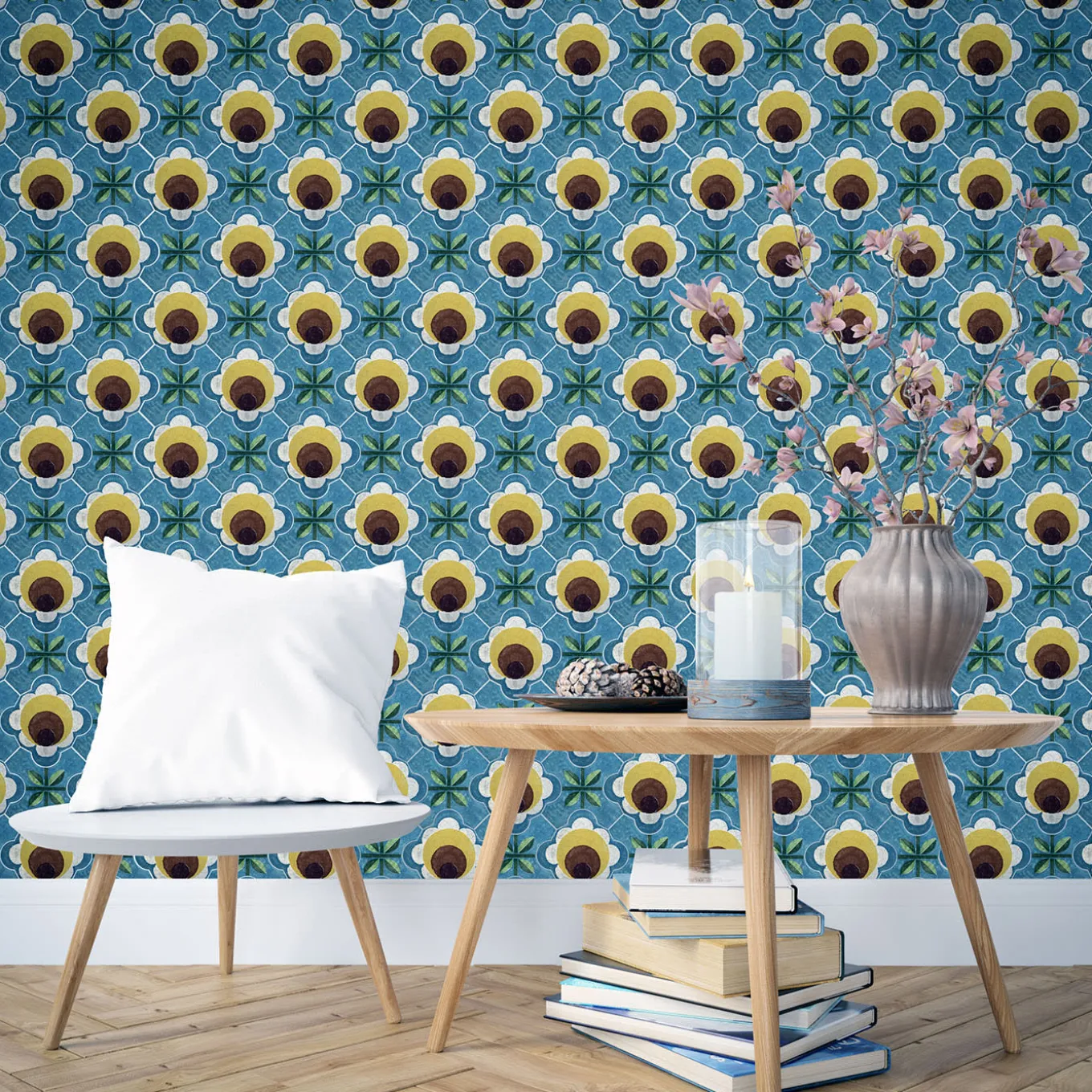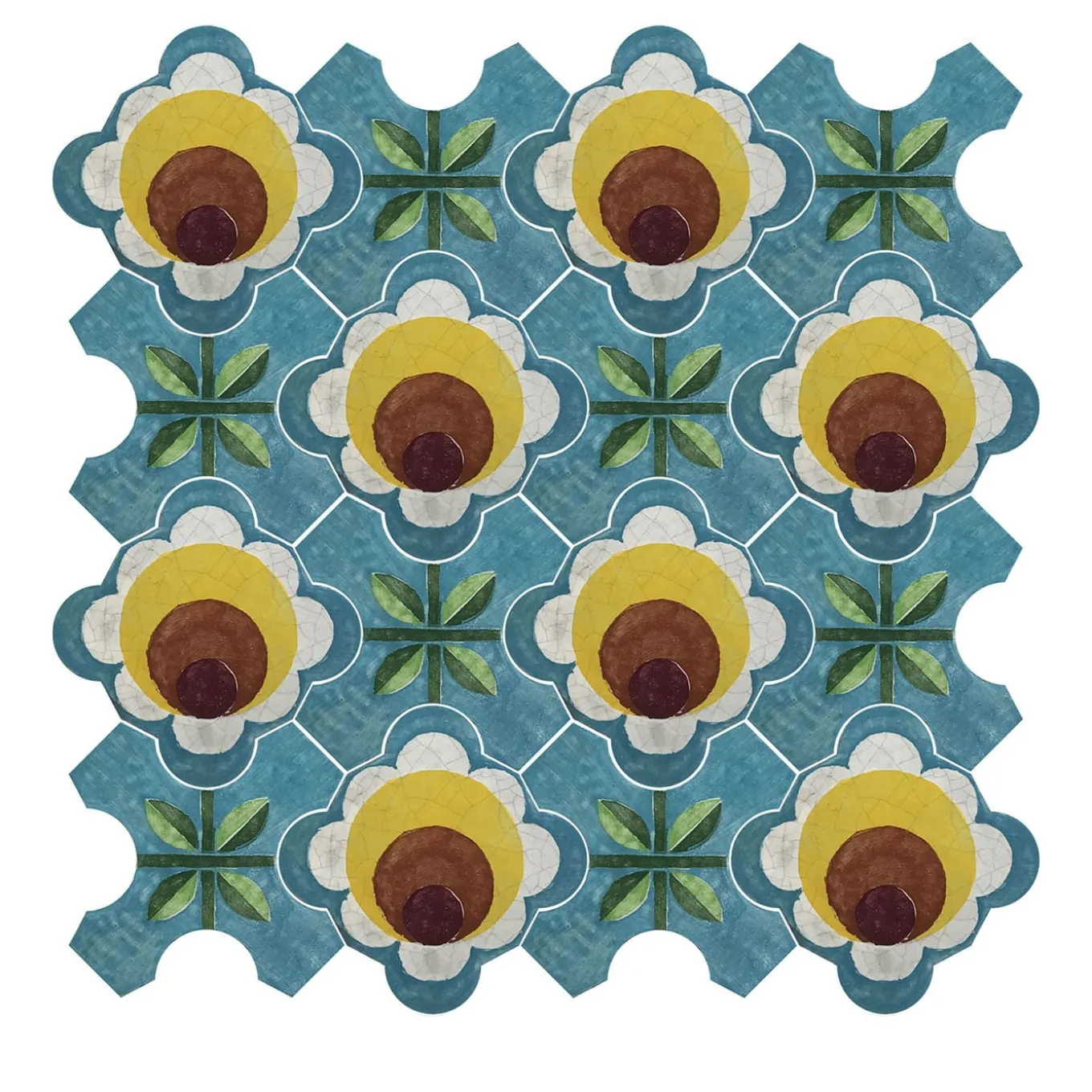 The geometric beauty of the Celeste ceramic tile composition shines through its hand-painted floral motifs in shades of yellow, green, and brown on a light blue base. The combination of flower and cross-shaped tiles creates a bold, retro-inspired pattern, perfect for adding dynamic style to walls or floors. Crafted from matte-finished terracotta, this 1970s-inspired design brings vibrant charm to any space. Price is per square meter. For more details, please contact the Concierge.