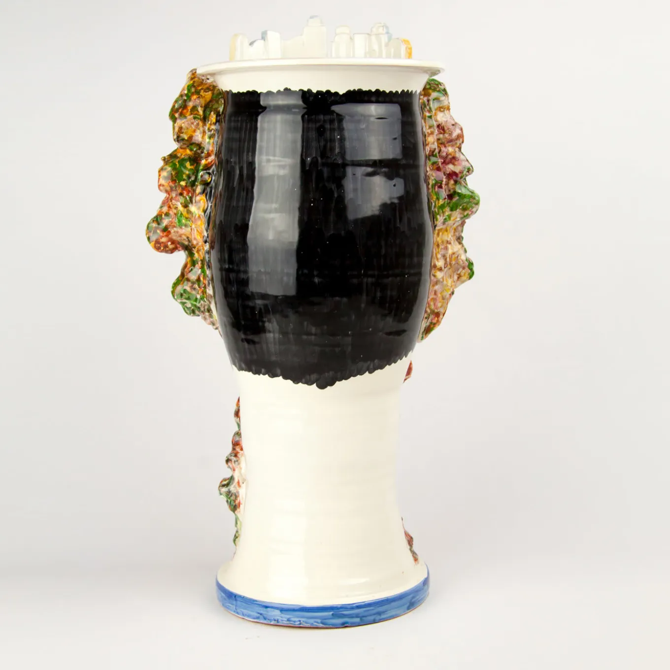 This large flower pot was achieved using a combination of a lathe, and hand modeling of the details. Depicted on the vase is a woman’s face surrounded by various plants. The woman’s head supports the skyline of the city of New York.