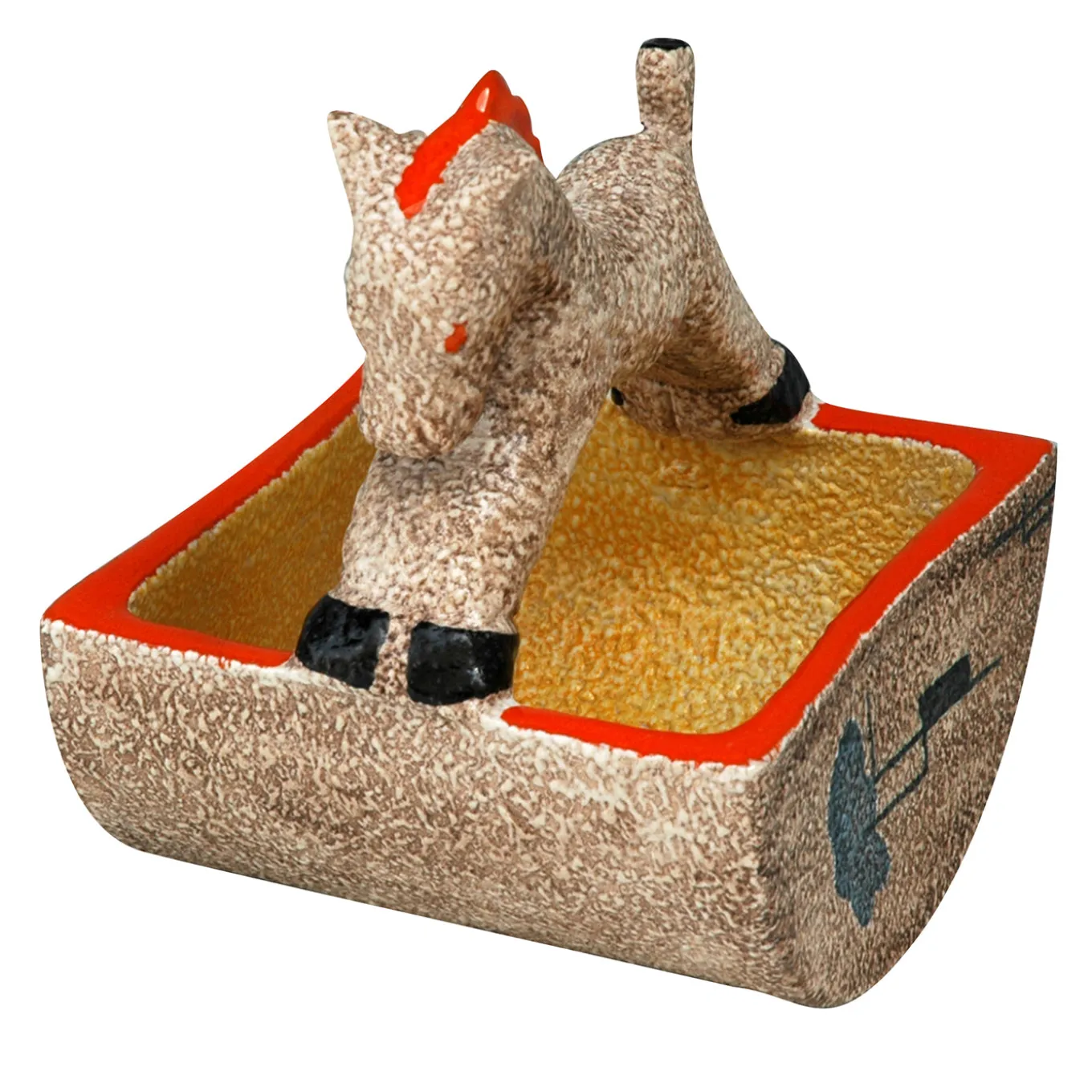 The Cestino Cavalluccio sculpture reinterprets an original design by Nino Strada from the 1930s Futurist movement. Featuring a stylized horse figure integrated into a textured square container with vibrant accents, this piece combines artistic expression and functional design. Produced using traditional manual techniques and faithful to historical craftsmanship, it represents a notable example of 20th-century Italian ceramic art with strong cultural resonance. This reissue honors the collaboration of Futurist artists and the Mazzotti family in Albisola, Italy, preserving original drawings and methods passed down through generations.