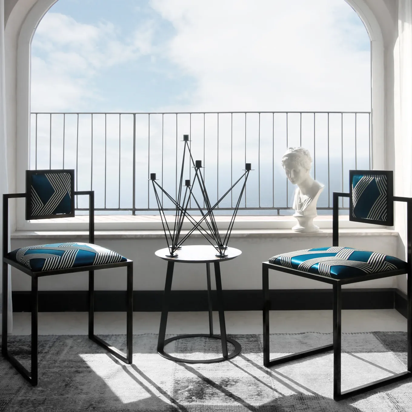Five-arm handmade sculptural candelabra in black painted wrought iron designed by Neapolitan Francesco Della Femina and handcrafted by skilled artisans in Italy. The original asymmetrical design is visually alluring and blends well with either a modern or classic interior style.