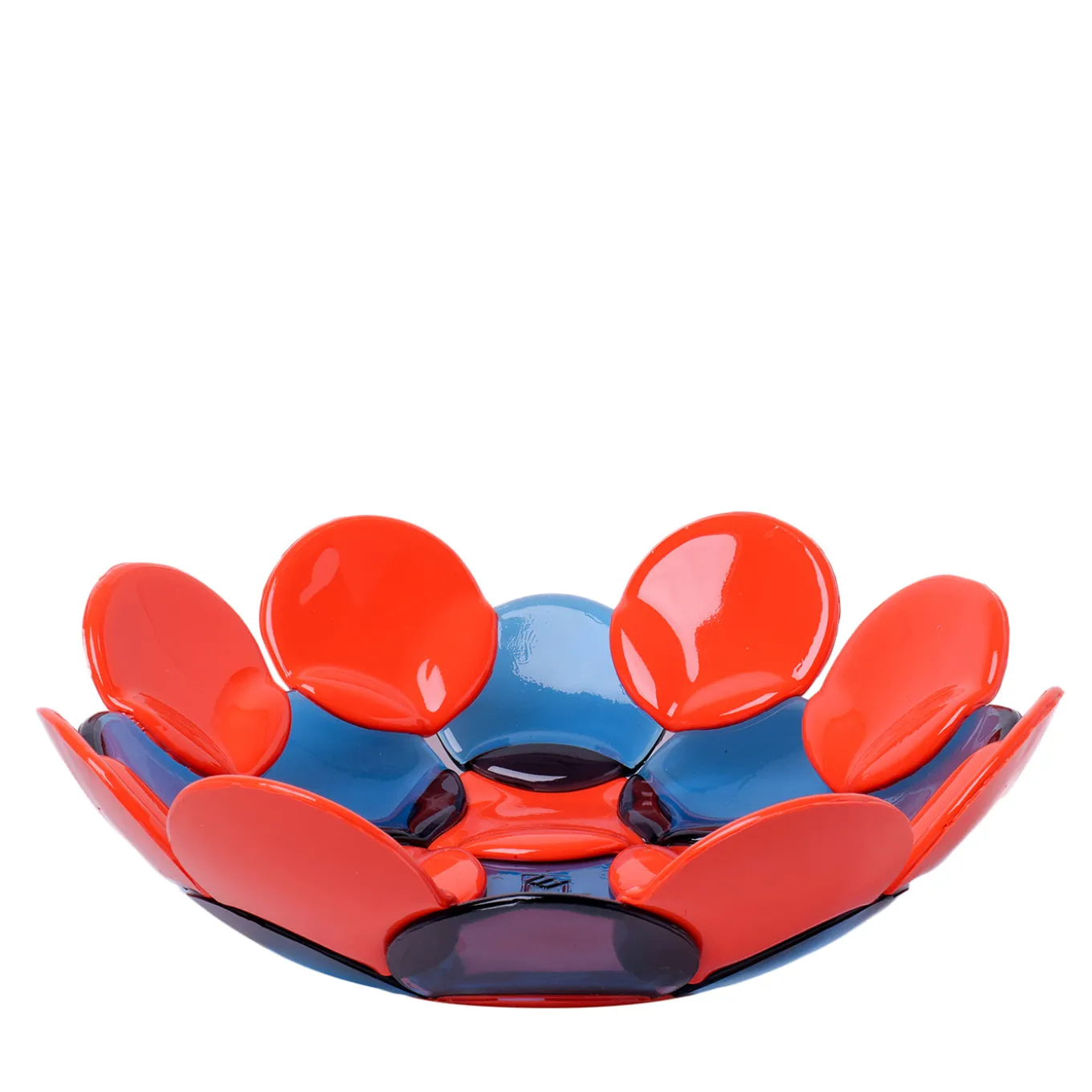 This centerpiece by Enzo Mari features a unique design inspired by natural circular forms, combining clear light blue and matt pastel orange resin elements. Measuring approximately 35-38cm in diameter and 8-12cm in height, this sculptural piece offers a bold, modern accent for any interior setting, suitable for use as a decorative object or functional centerpiece. Its distinctive color contrast and smooth, glossy finish create a visually striking addition to contemporary home décor.