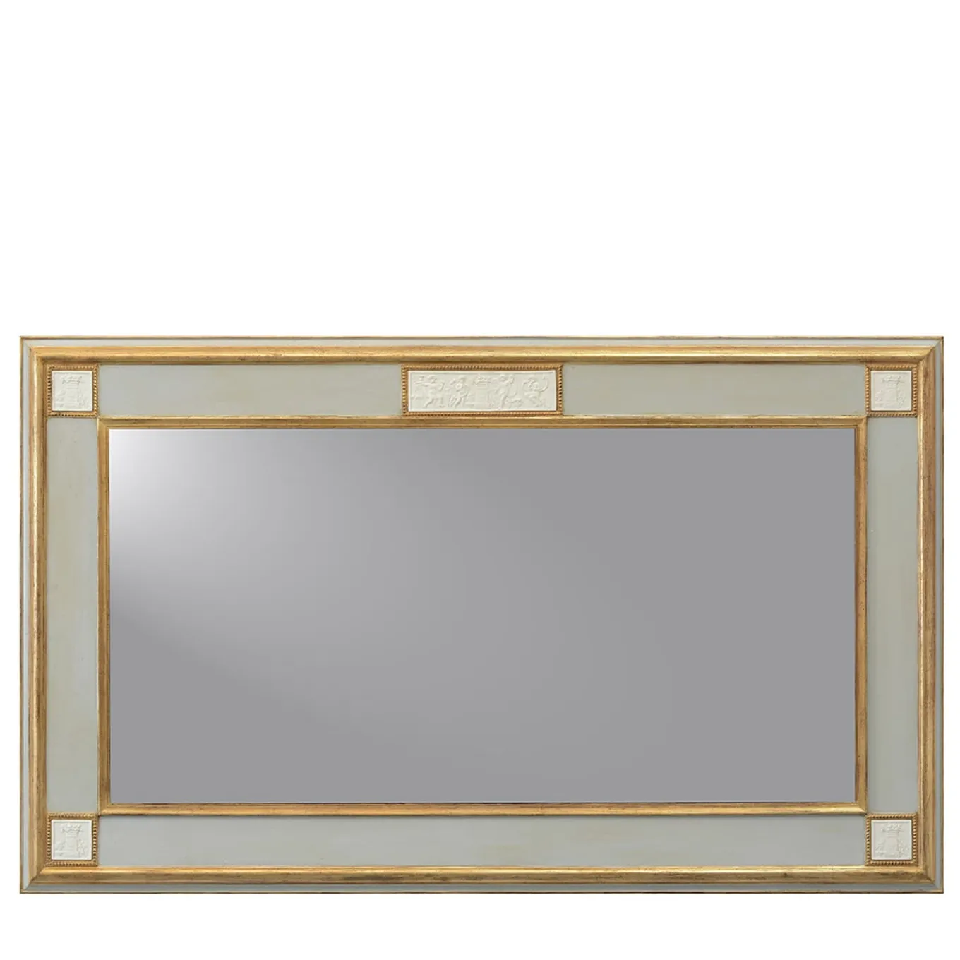 A horizontal wall mirror featuring a classic gilded frame with delicate ornamental detailing. The frame incorporates hand-modeled capodimonte biscuit porcelain plaques depicting allegorical scenes, adding artistic depth and refinement. Finished in a lacquered surface with customizable size and finish options, this mirror lends a sophisticated and timeless accent to interior spaces. Please contact the Concierge for more details.
