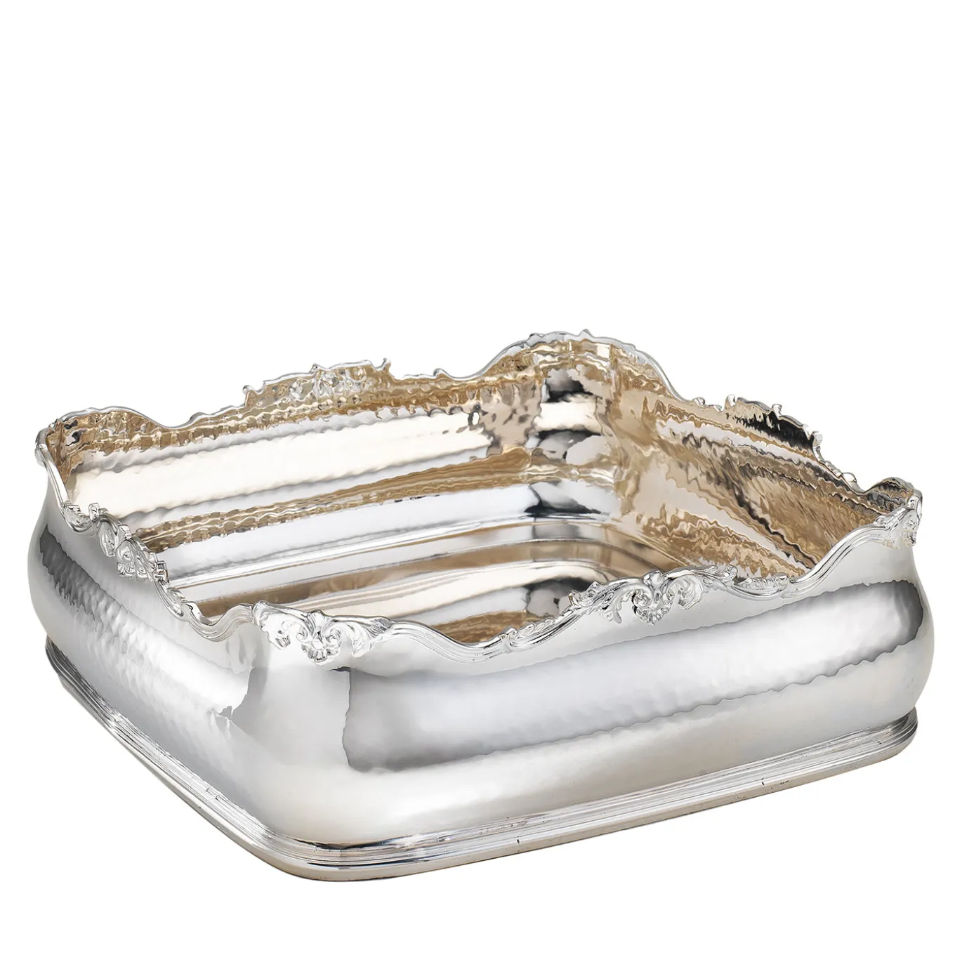 A superb solution for gathering fruits on opulent classic-style tables, this centerpiece bowl is sure to capture the eye with the richly ornate design extending throughout its rim. The cleverly rounded corners soften its squared silhouette, while the all-over silver plating lends the surface a stupefying gleaming look. It will also serve as a sublime vide-poche on top of entryway consoles.