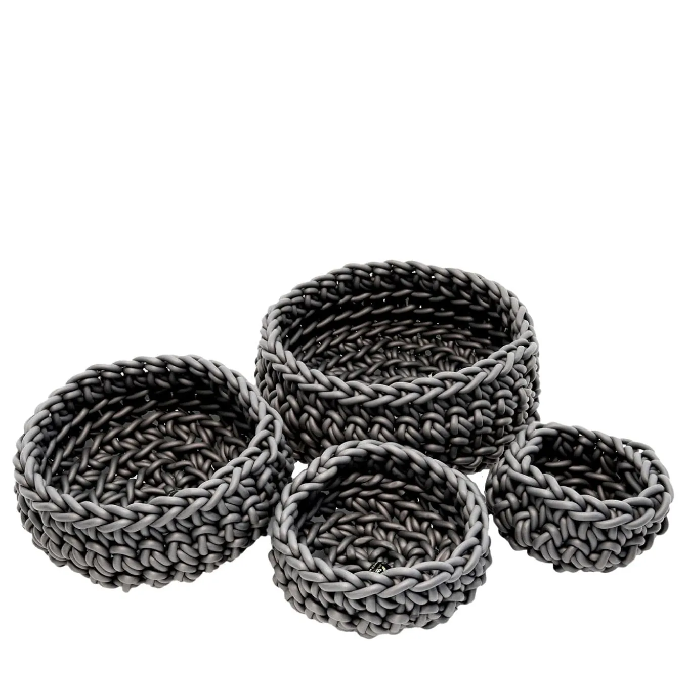 An exquisite set to decorate a contemporary setting with utmost style, these four baskets feature different shapes, each hand-crocheted of 8mm-thick gray waterproof neoprene. Suitable for both indoor and outdoor use, it is available in various sizes and colors. Please consult the Artemest catalog for available options.
