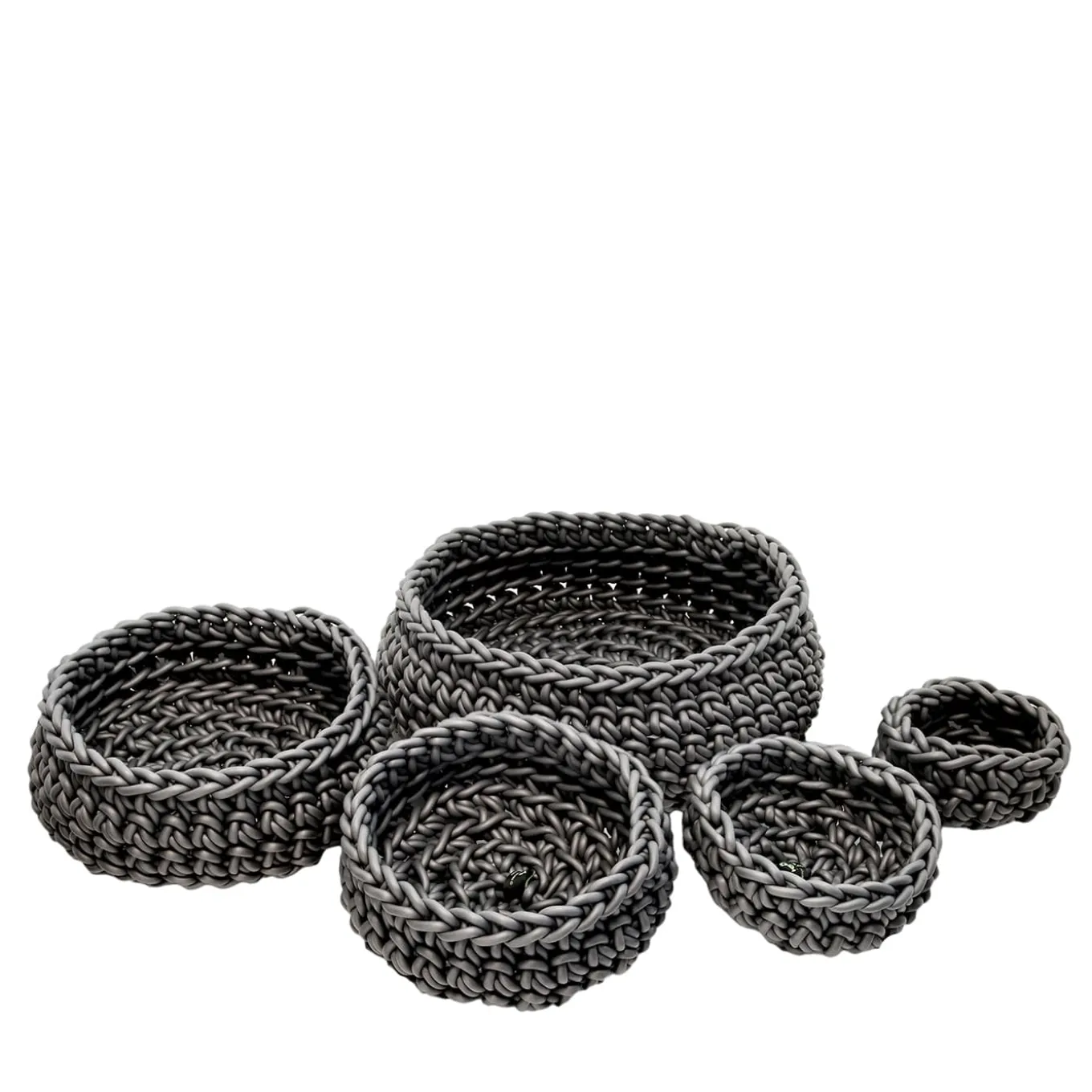 An exquisite set to decorate a contemporary setting with utmost style, these four baskets feature different shapes, each hand-crocheted of 8mm-thick grey waterproof neoprene. Suitable for both indoor and outdoor use, it is available in various sizes and colors. Please consult the Artemest catalog for available options.