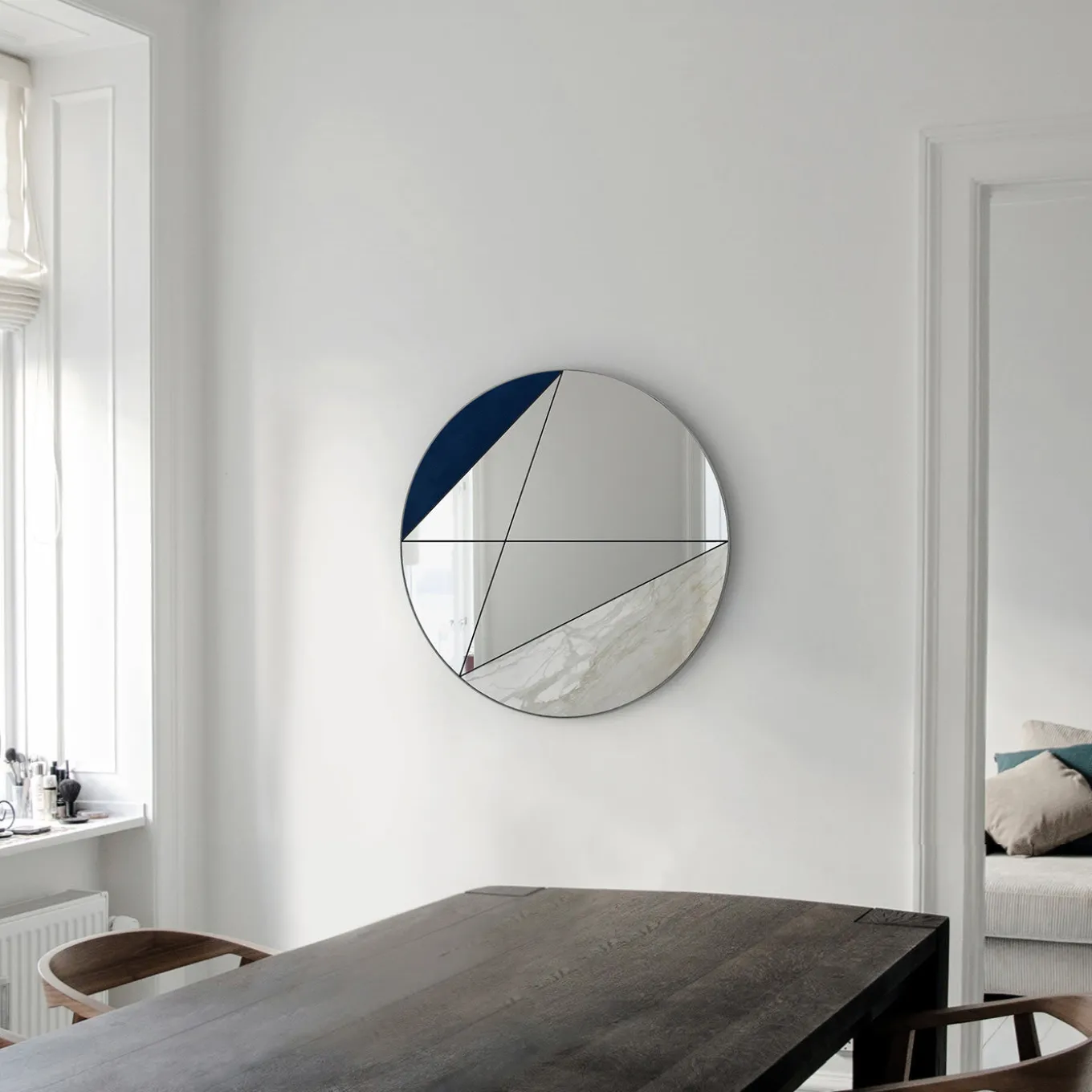 Made entirely by hand, ensuring no two pieces are exactly the same, the Clepsydra I Mirror is characterized by a unique pairing of blue leather and Calacatta marble. The mirror is completed by its signature stainless steel lines, inspired by lives that may or may not ever cross paths.