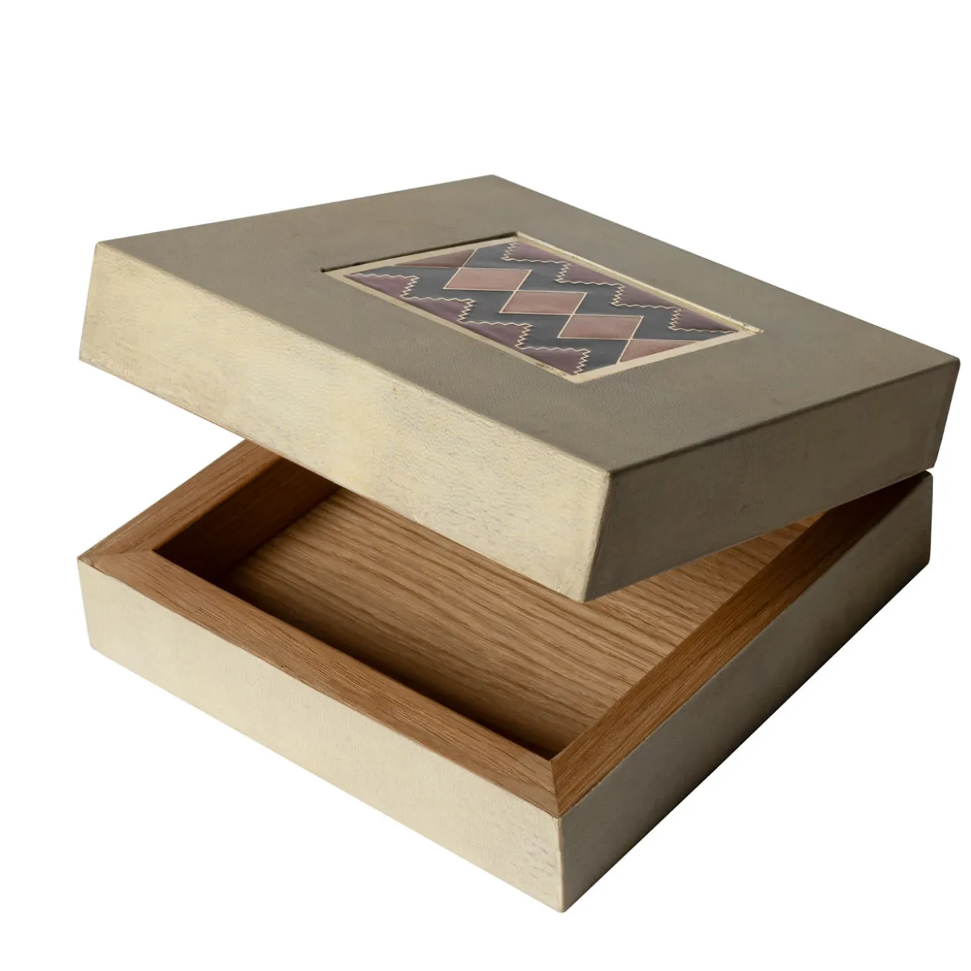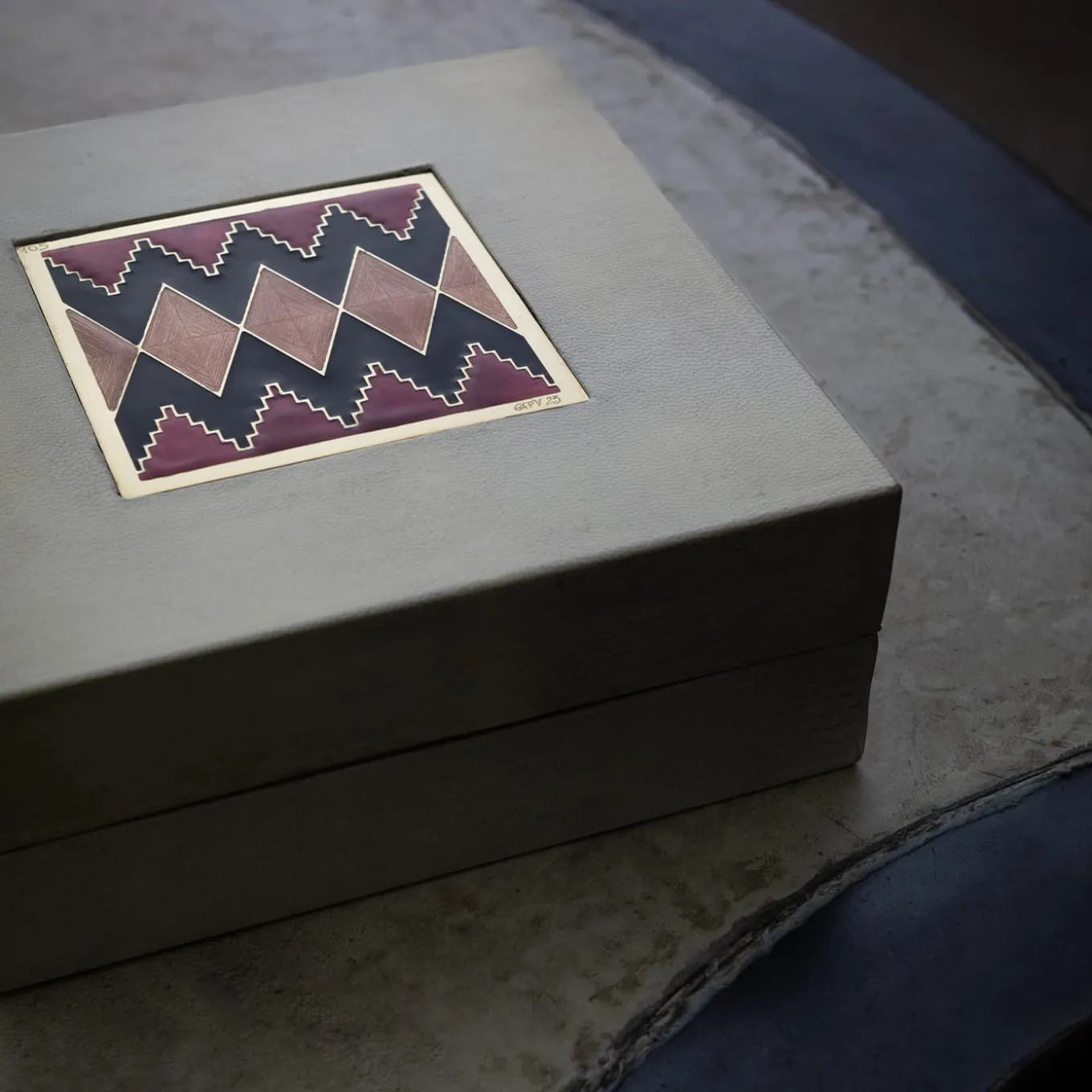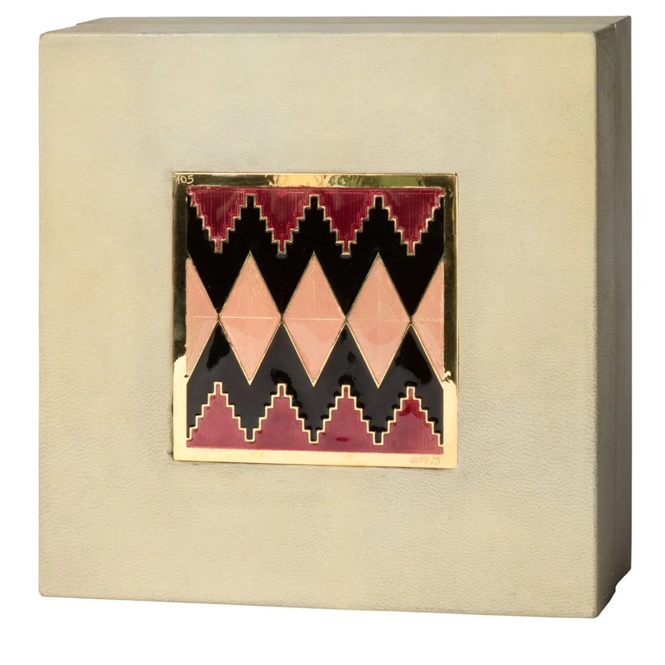 The “Carré Cloisonné boxes” by Piccoli Smalti are refined objects designed to blend functionality and a jewel- like aesthetic. The square box is completely finished in a delicate , ivory color, parchment covering. The top cover is decorated with a precious carré cloisonné handcrafted in Tuscany with pink and black geometric figures colored. The inside part is displaying a single capacious compartment in order to accomplish different uses.