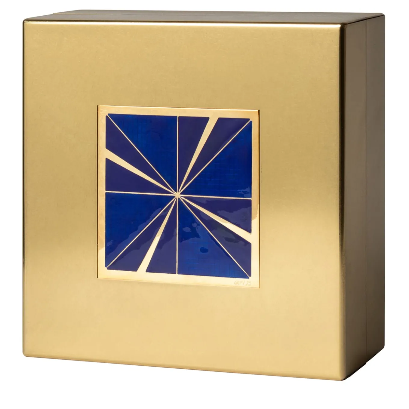 The “Carré Cloisonné boxes” by Piccoli Smalti are refined objects designed to blend functionality and a jewel- like aesthetic. The square box is coated in satin brass. The top cover is decorated with a precious carré cloisonné handcrafted in Tuscany with lapis blue geometric figures colored. The inside part is displaying a single capacious compartment in order to accomplish different uses.