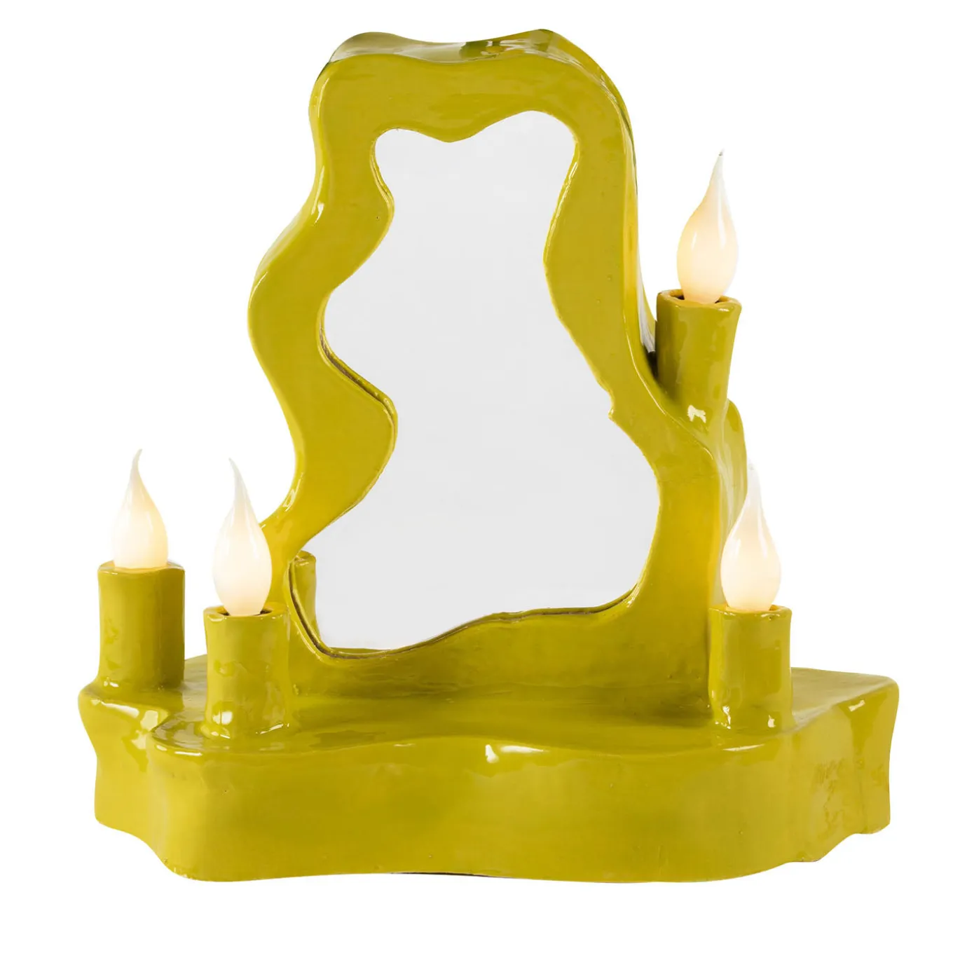 A yellow ceramic illuminated table mirror with an organic, cloud-inspired silhouette, featuring softly irregular shapes that enhance its warm, nostalgic appeal. Designed to evoke the feeling of summer days spent lying on grass, the piece integrates four flame-shaped lights, blending decorative lighting with practical reflection. Part of the “Can You Imagine?” collection that explores creativity through poetic, nature-inspired forms, the mirror invites imaginative interaction beyond its surface. Bulbs are not included. Limited edition of 9 pieces.