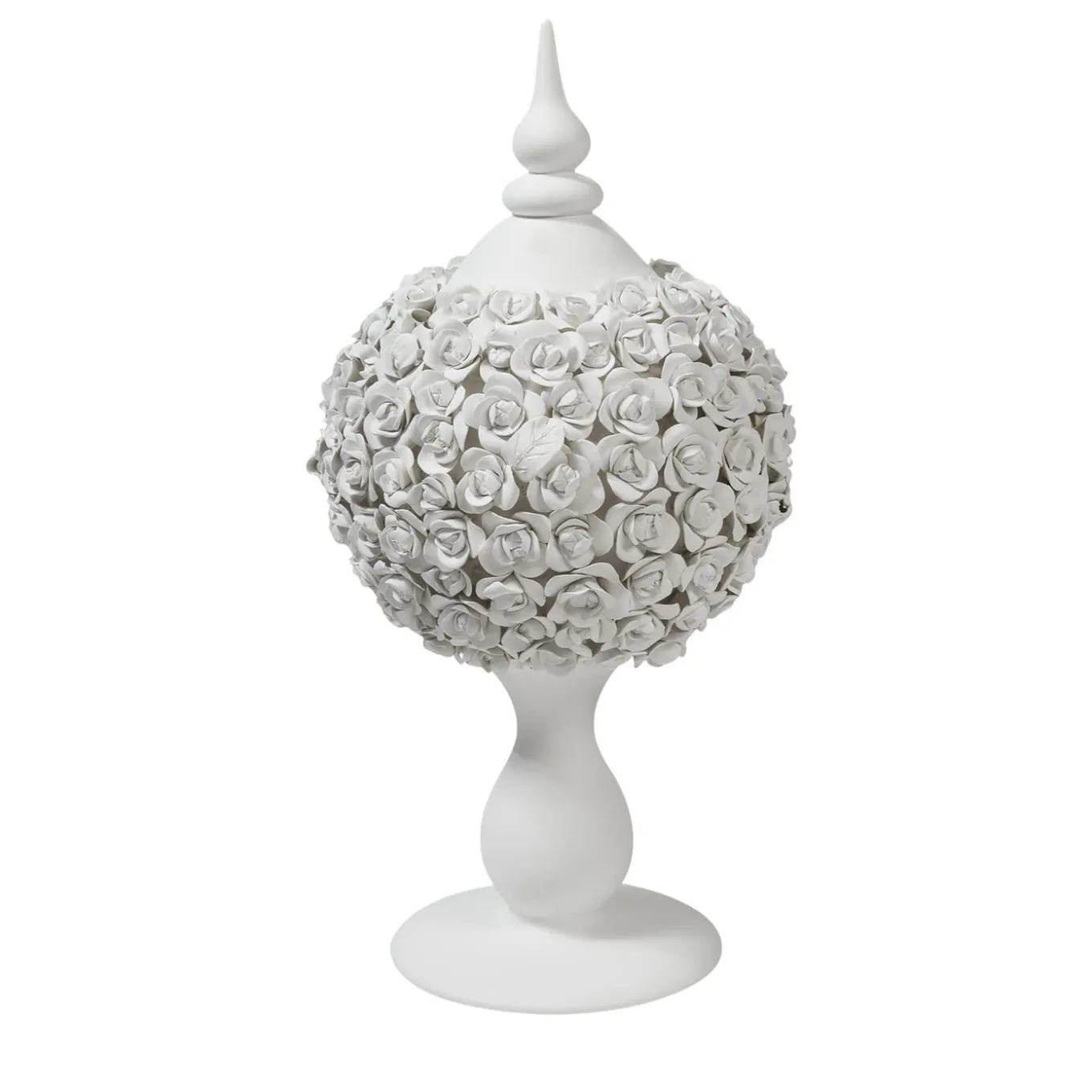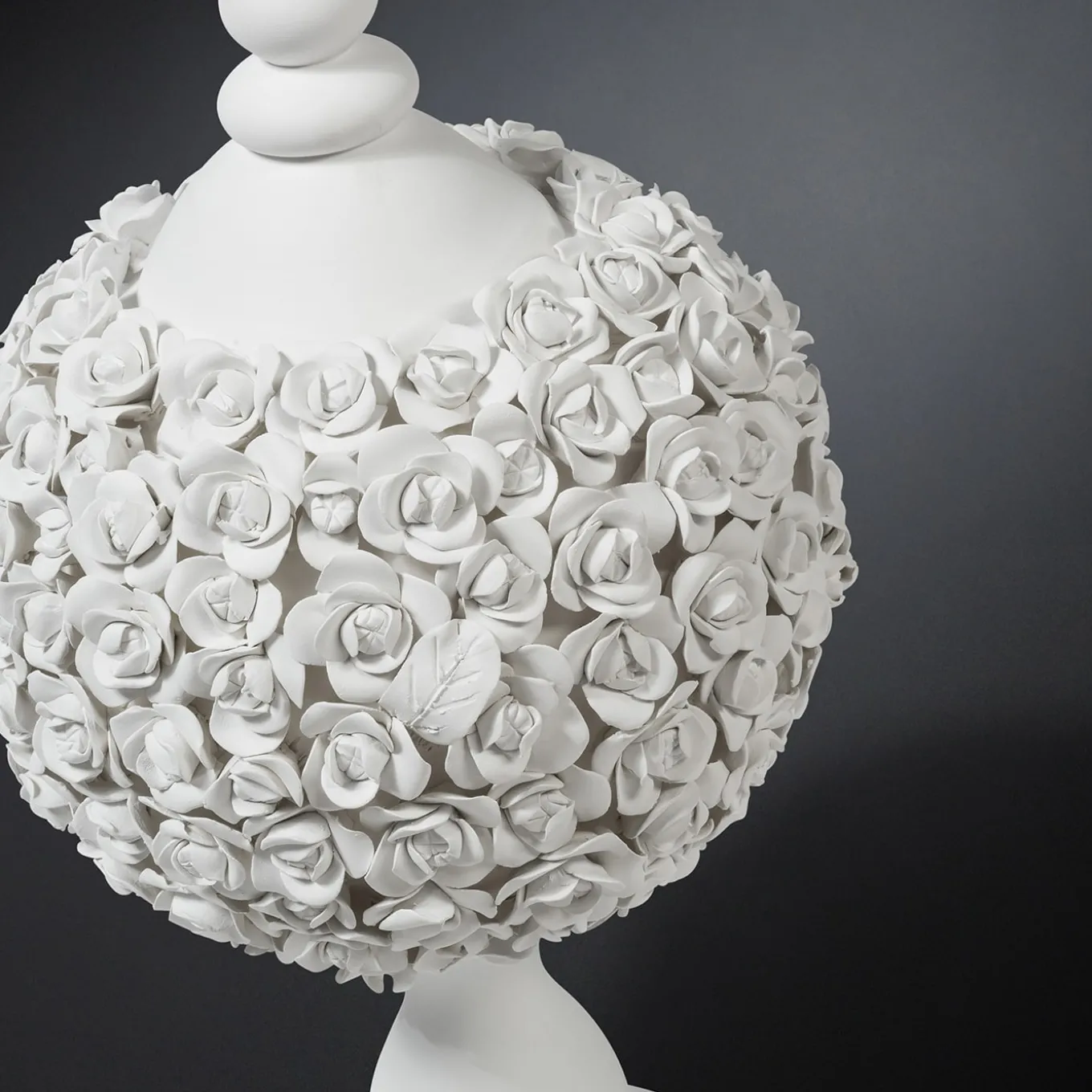 A refined solution to elevate the sophistication and romanticism in wedding banquets or everyday contemporary homes, alike, this sinuous ceramic sculpture incorporates a spherical camellias bouquet. The flowers’ hyperrealistic look is owed to the painstaking work of master artisans who follow the entire crafting process.