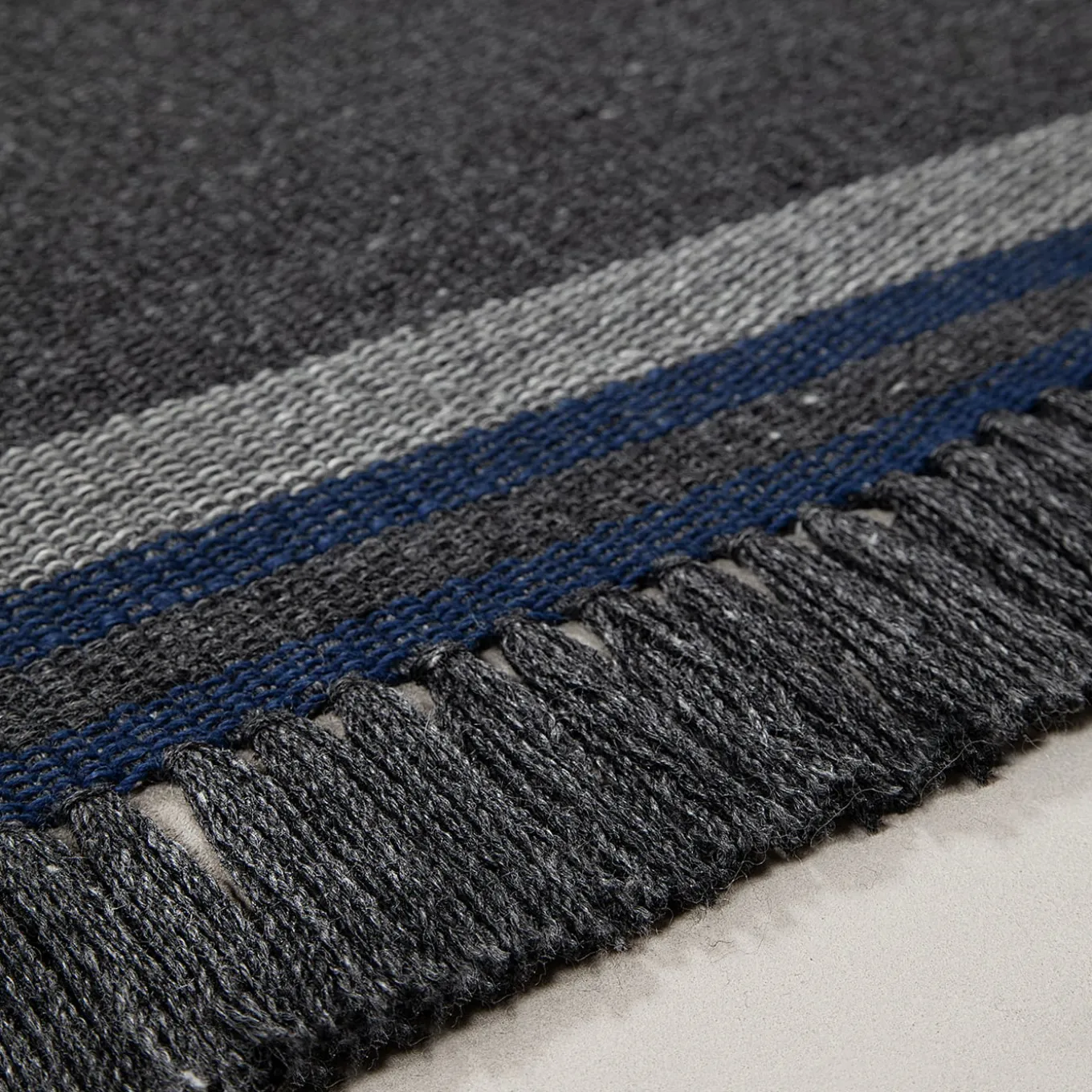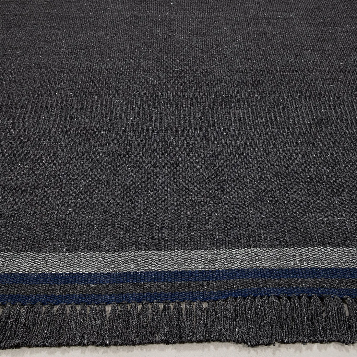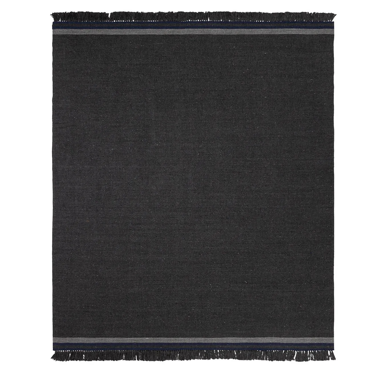 Minimalist yet striking, this charcoal black rug features deep blue striped details that subtly break its monochrome aesthetic, creating a refined contrast. The flat-woven structure ensures it is durable and visually appealing, making it ideal for indoor and outdoor use. Crafted from 100% recycled PET, this rug seamlessly fuses timeless sophistication with environmental responsibility, delivering a stylish and enduring statement piece. Suitable for both outdoor and indoor use.