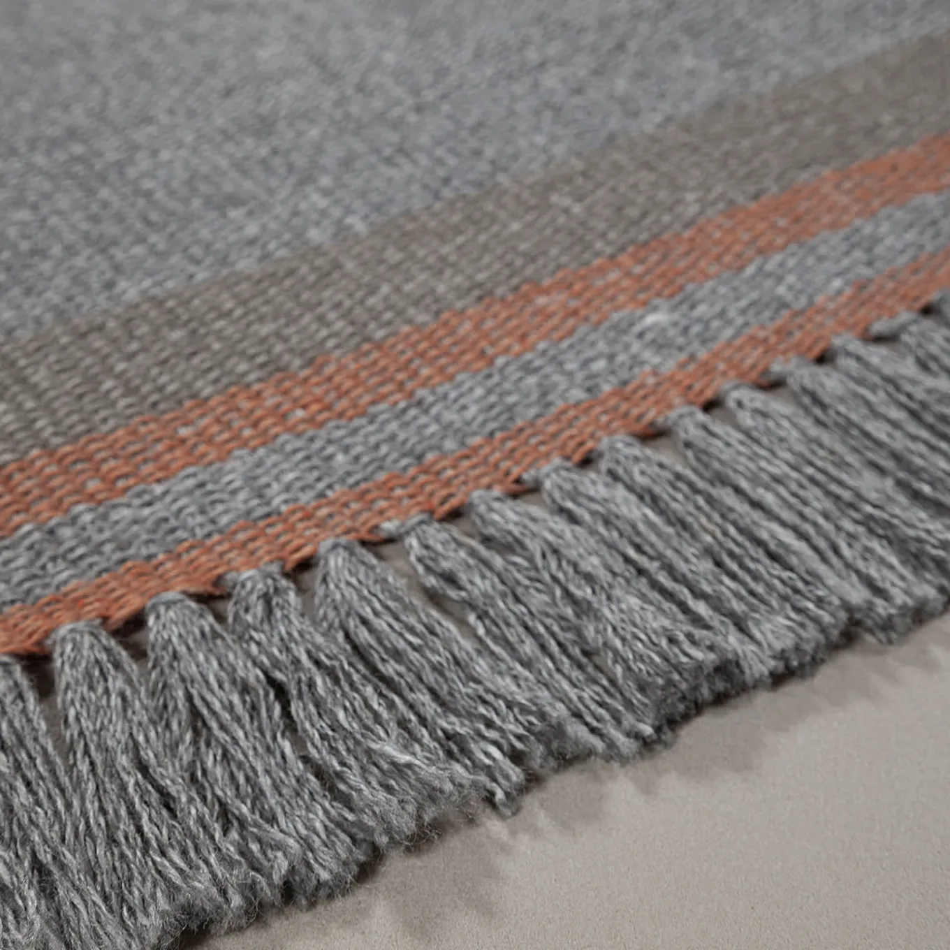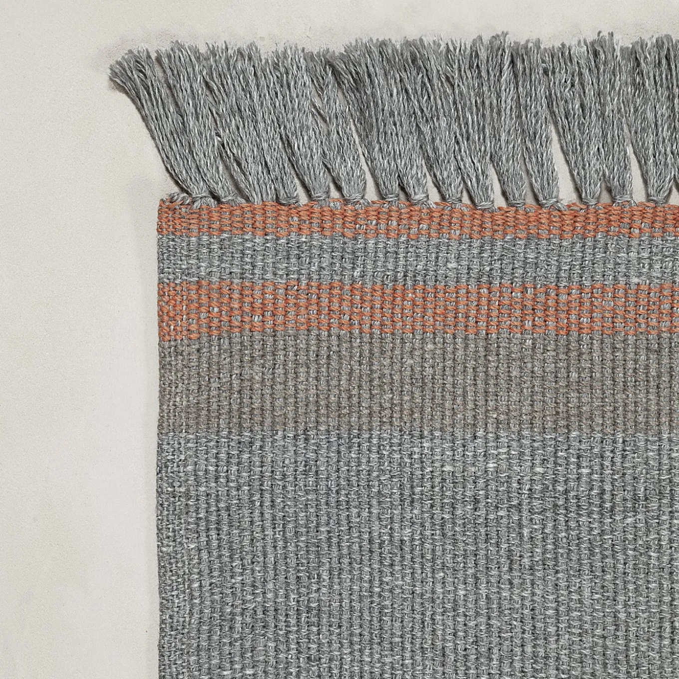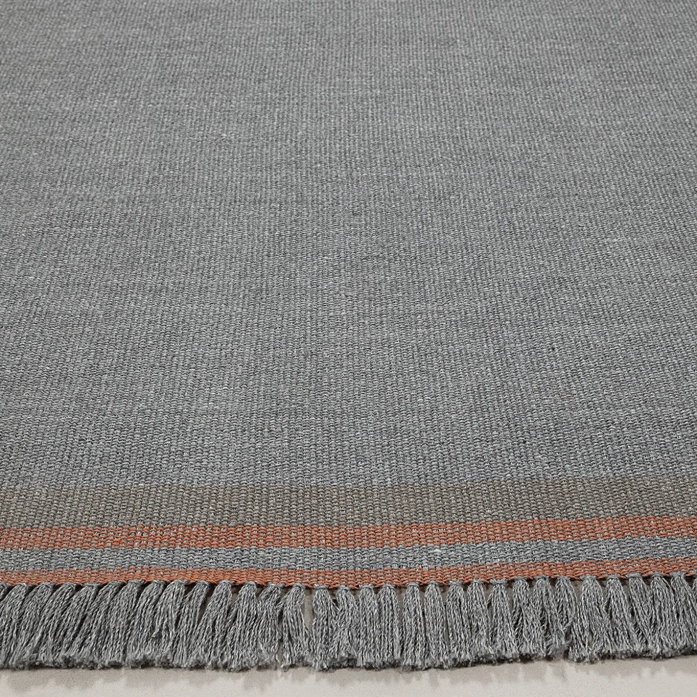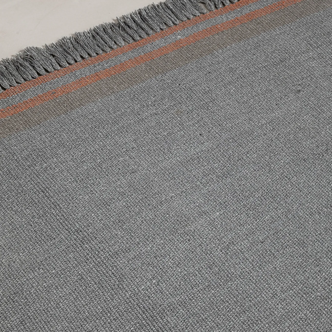 A seamless blend of vintage inspiration and modern craftsmanship, this flat-woven gray rug is delicately accented with warm coral stripes, adding a subtle yet refined contrast. Its tight weave structure ensures durability, making it a versatile piece for both indoor and outdoor settings. Crafted from 100% recycled PET, it embodies sustainability and timeless appeal, bringing a sophisticated touch to contemporary and rustic interiors alike. Suitable for both outdoor and indoor use.