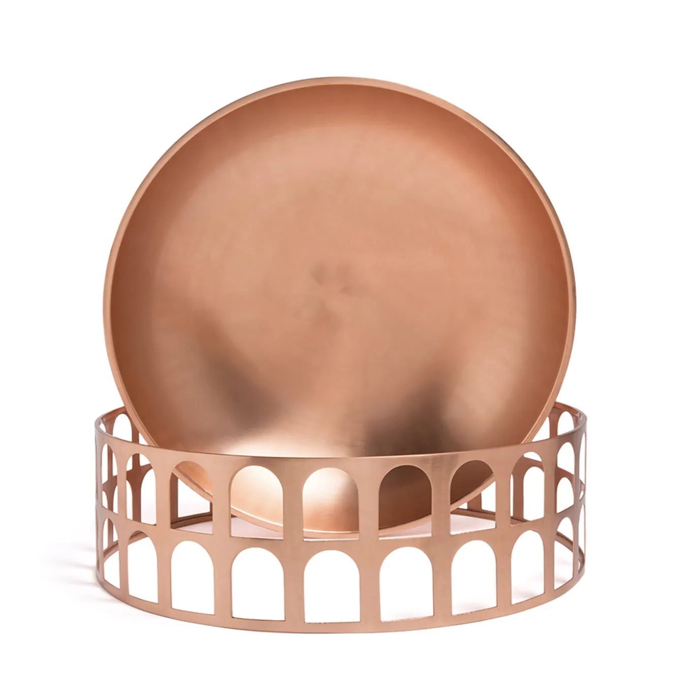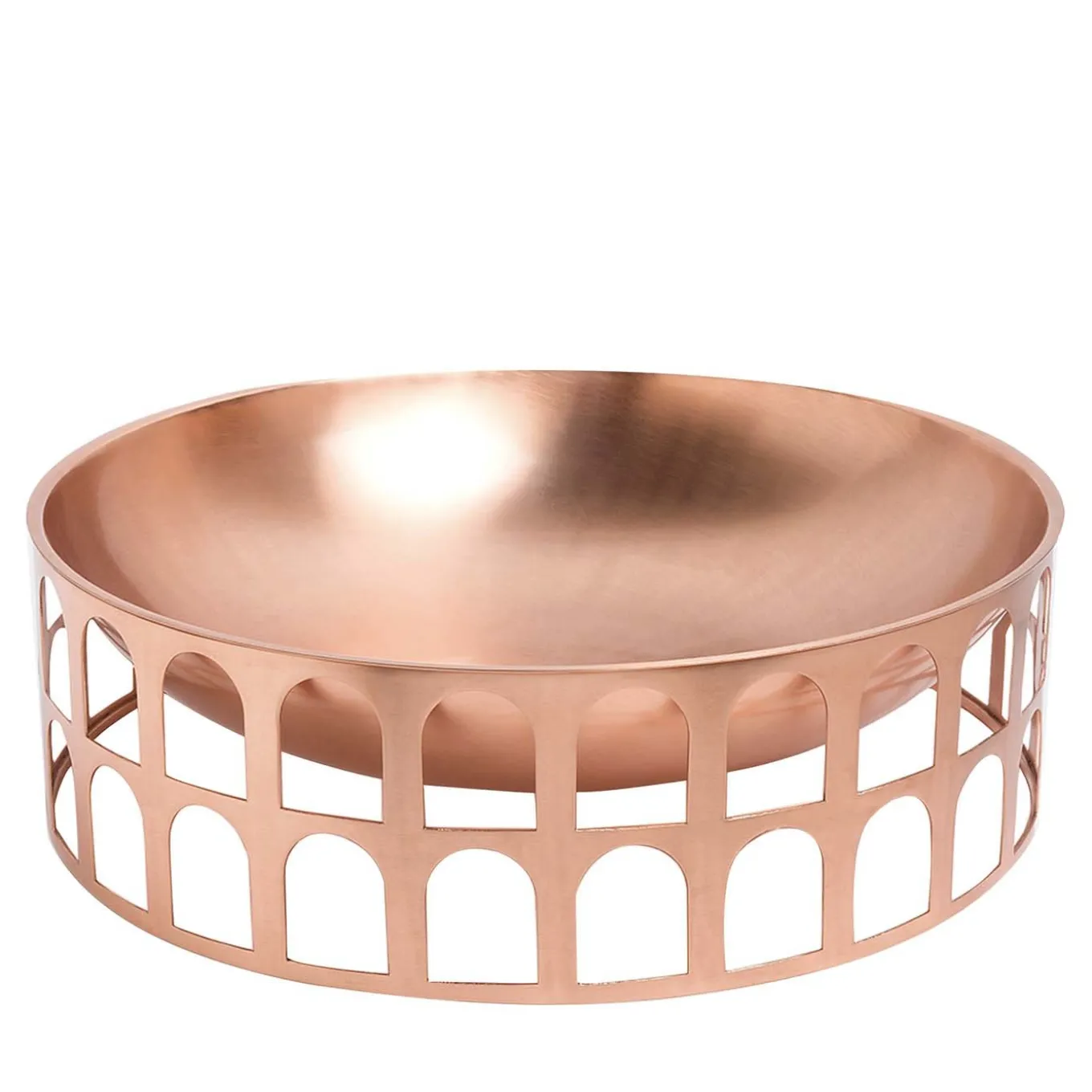 A stunning centerpiece that celebrates the majestic design and imposing allure of the Colosseum in Rome, this exquisite and versatile object of functional decor was designed by Jaime Hayon and is part of the New Roman collection, inspired by ancient tableware revisited with contemporary sensibility. Entirely made of copper, the round silhouette of the semi-spherical bowl is supported and enclosed by a frame that boasts two layers of arches, hinting at the iconic exterior of the building.