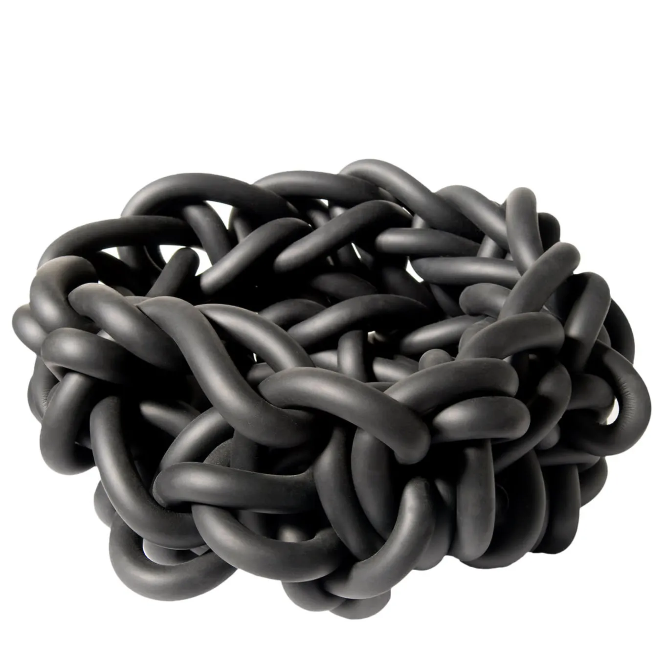 An innovative and sophisticated design that will exquisitely decorate a contemporary setting in both indoor and outdoor areas, this basket showcases a striking sculptural shape. It is hand-knotted with 25mm-thick black waterproof neoprene yarn. Part of the Colosso Collection, it is also available in pearl gray and dark gray, please consult the Artemest catalog for options.