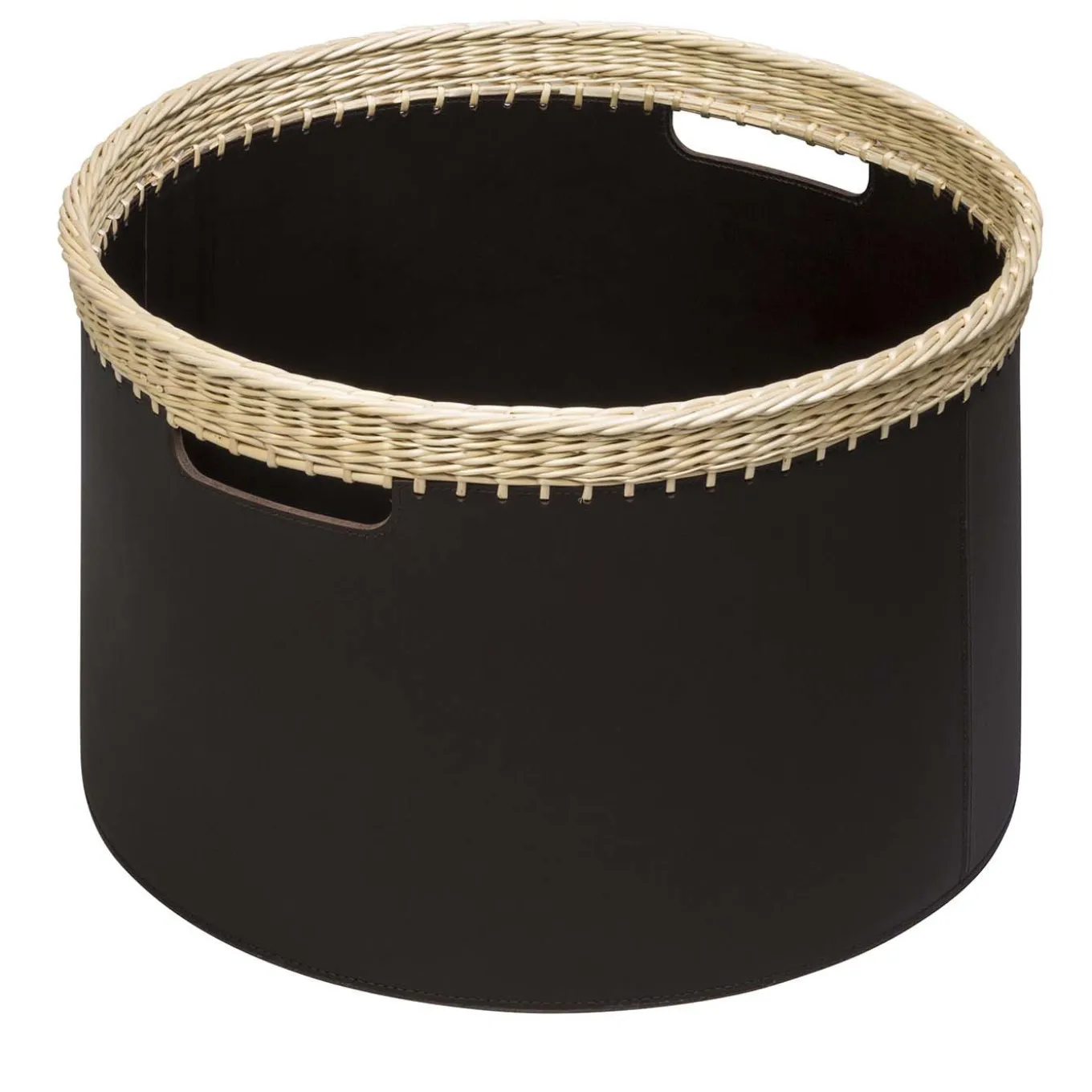 Part of the Como Collection of baskets entirely handcrafted of soft saddle leather in classic colors, this is a refined storage solution that can be used anywhere in the house. Its round shape features rectangular cut-out handles and an eye-catching hand-woven trim around the border in natural wicker that creates a striking contrast with the black color of the leather. Mixed with the other pieces of the collection, this basket is a superb way to store miscellaneous items in the bedroom, living room or bathroom.