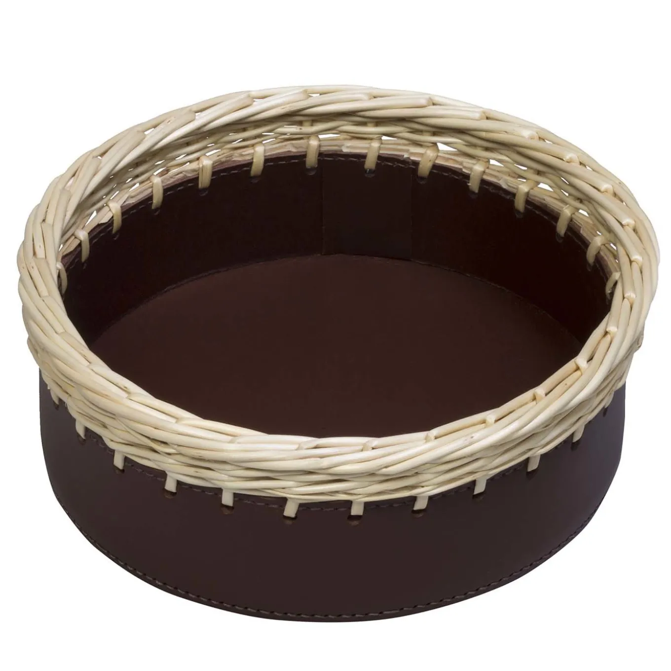 A precious addition to a rustic country home or to add a natural accent to a contemporary interior, this valet tray is as versatile as it is striking. Its round silhouette in saddle leather dyed with vegetable pigments is adorned with a decoration in wicker around the rim that adds a striking textural decoration to the piece. It can be displayed alone or with the other boxes and containers by Rabitti 1969 on an entryway console, living room side table, or bedroom vanity.