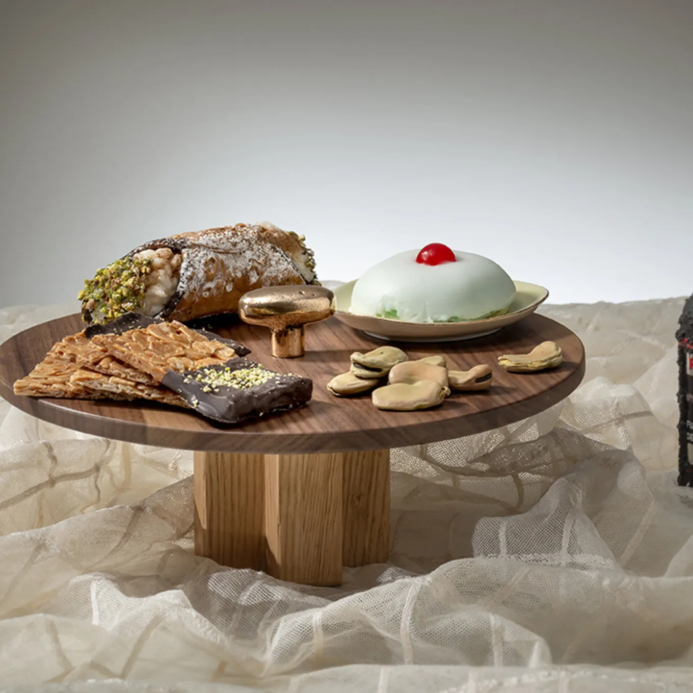 This sophisticated centerpiece is part of the collection celebrating artist Constantin Brancusi’s sculptures. Mounted on a cross-shaped base in brushed oak wood, the circular tray in Canaletto walnut is equipped with a dainty, drop-shaped handle in melted bronze. The timbers’ peculiar grains contribute to the visual and tactile appeal of this centerpiece, which comes in a refined gray gift box showcasing the Colè’s silver logo.