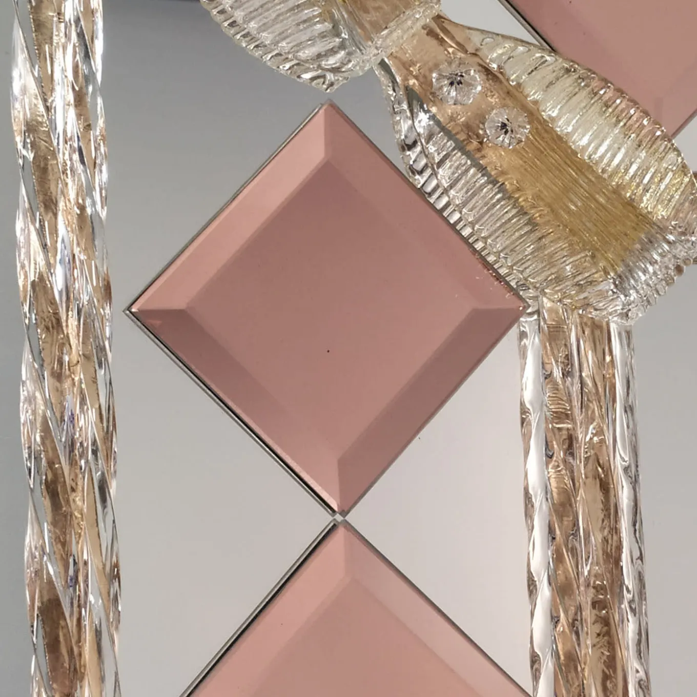 This rectangular mirror is a showcase of unrivaled craftsmanship achieved by Murano master glassmakers according to traditional 14th-century techniques. The wide frame embracing the mirror is adorned with dainty flowers and leaves in transparent and golden Murano glass, juxtaposed to an array of pink glass squares deftly cut by hand for an additional romantic touch.