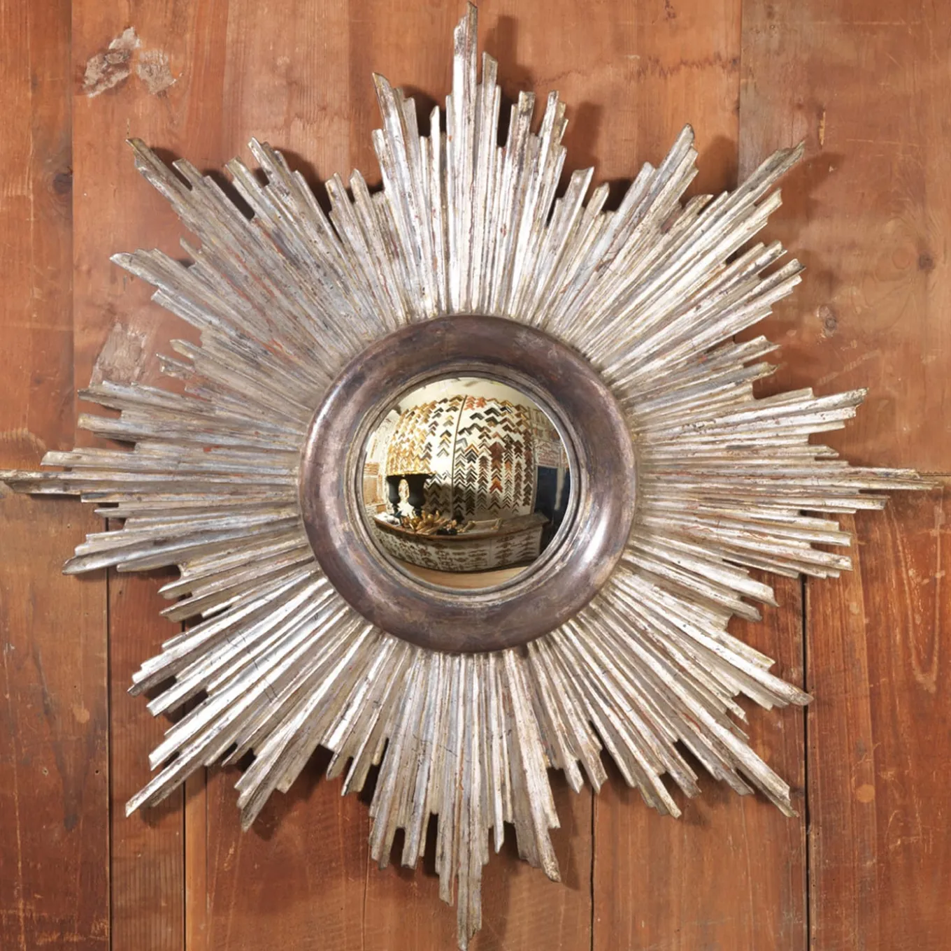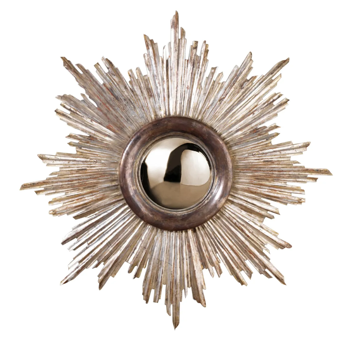 This handcrafted mirror is a faithful reproduction of an original sunburst model. Entirely made of hand-carved wood and decorated in silver leaf by Castorina in Florence, the piece comes with a bespoke convex mirror.