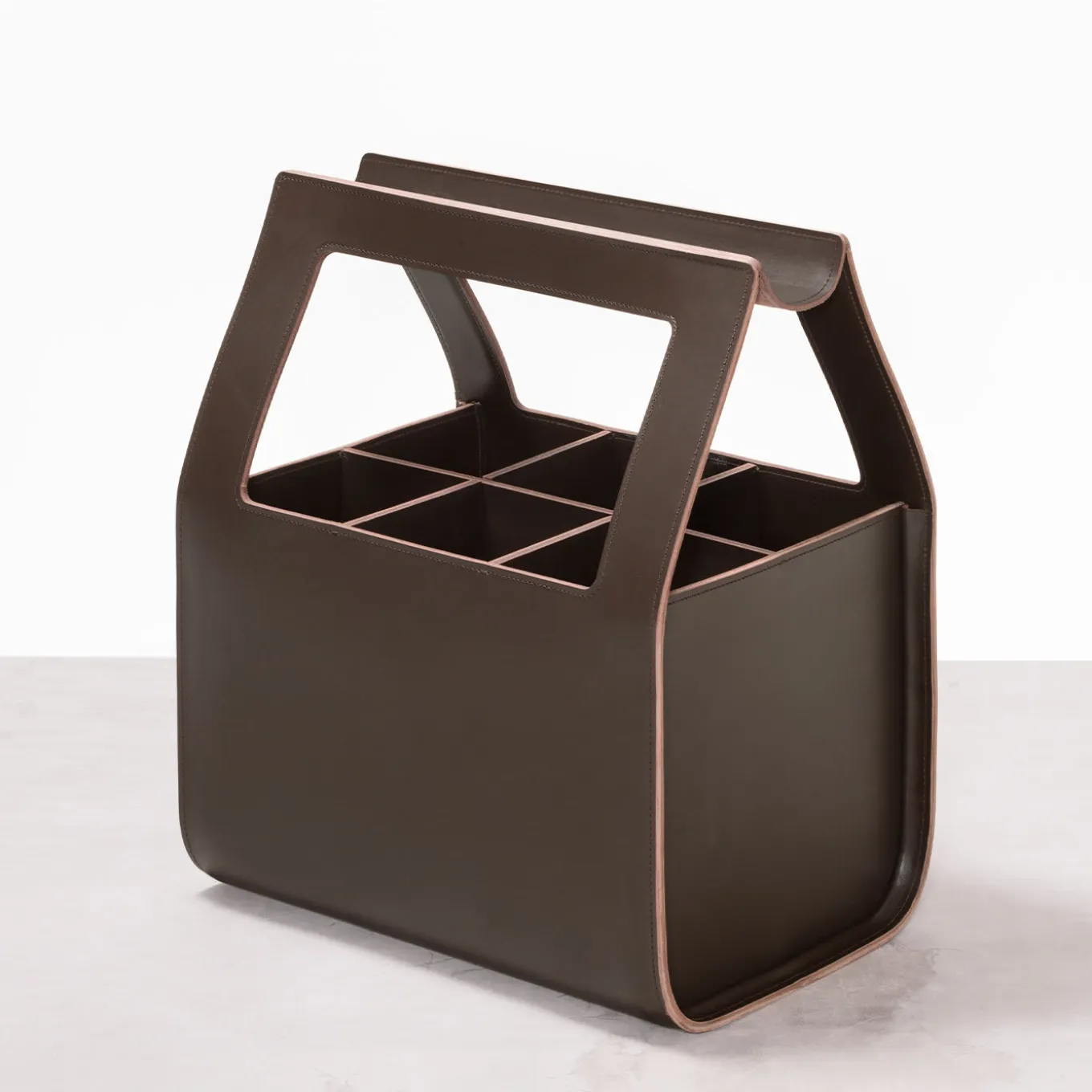 With a multipurpose character and an original and fascinating charm, this artful basket belongs to a refined series of saddle leather baskets designed by Gio Tirotto. Deftly handcrafted, it features a dark brown color enhanced with tone-on-tone stitchings and is equipped with six practical dividers. Also available in other colors from the Rabitti 1969 palette: white, light grey, mud, graphite, black, mocha, brown, cognac, natural, cream, yellow, mango, red, navy blue, and loden green.