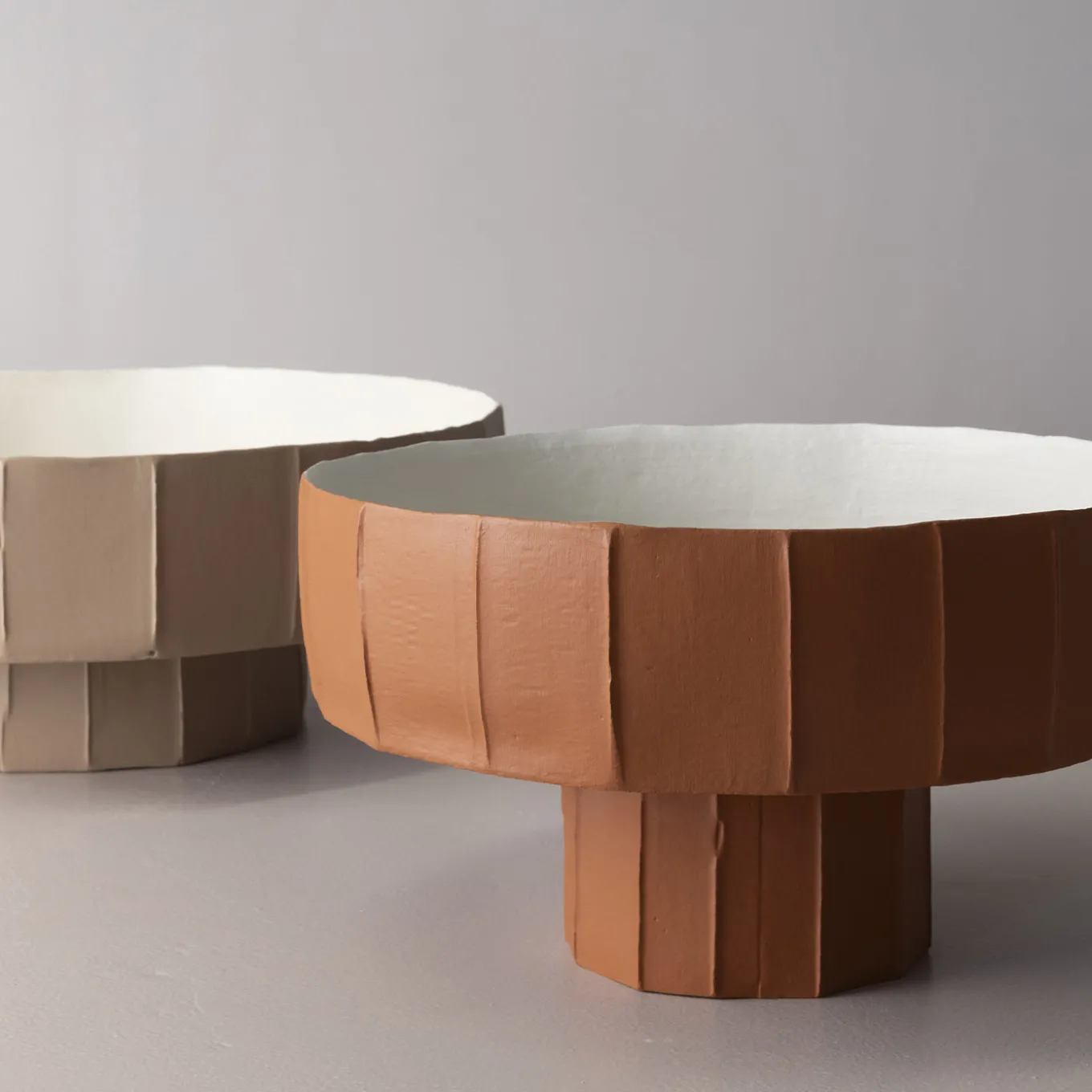 This sculptural centerpiece features elegant vertical grooves and a matte finish that evokes natural textures. Its balanced design pairs a wide, shallow basin with a sturdy base, ideal for decorative use on tables. Each piece is created through a meticulous modeling and firing process, resulting in subtle variations that emphasize its uniqueness. The refined and tactile form enhances contemporary interiors with an artistic touch.