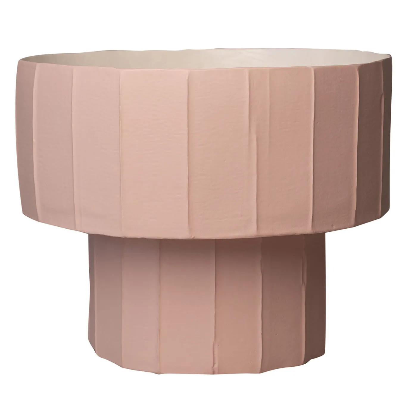 This centerpiece features an elegant, sculptural design characterized by vertical grooves and a matte finish reminiscent of natural surfaces. The balanced form combines a wide, shallow basin with a sturdy base, creating a refined and tactile object. Each piece displays subtle variations due to its artisanal shaping and firing process, enhancing its unique aesthetic. Ideal for adding an artistic and contemporary touch to modern interiors.