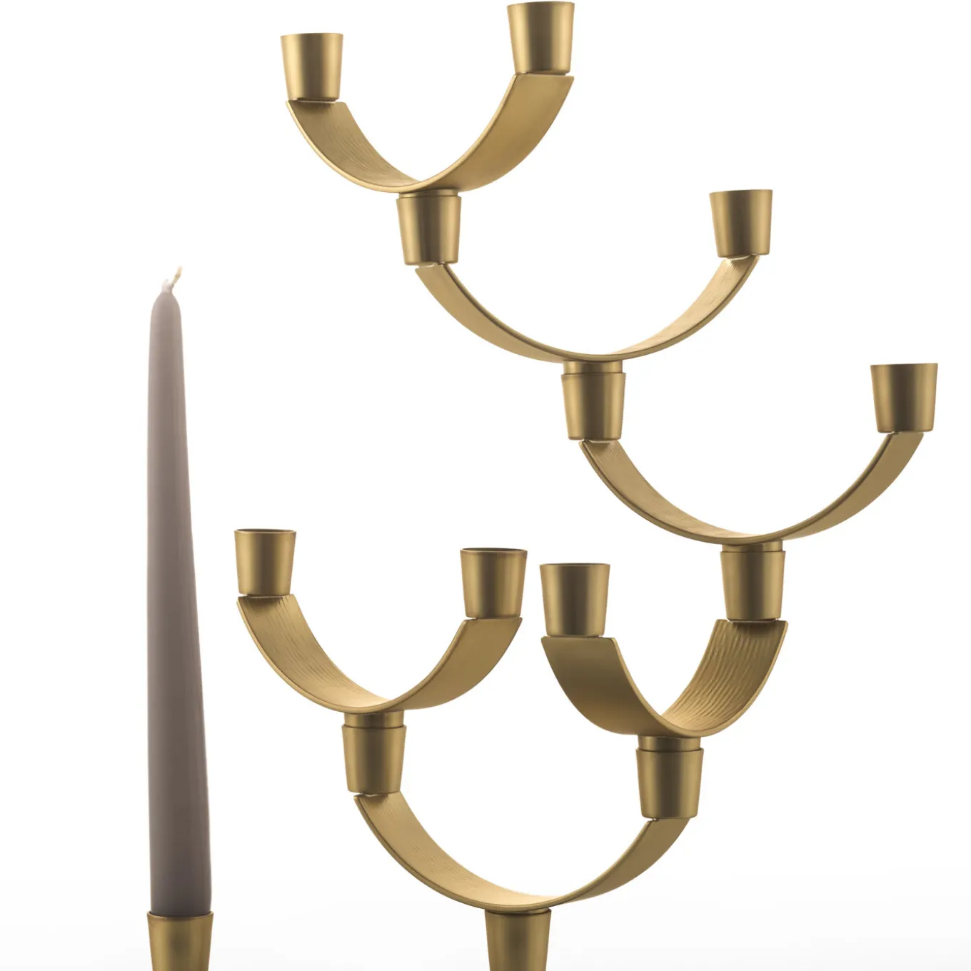 This striking piece is made entirely in brass with two different finishes: the rectangular base is bronzed while the seven semi-circular branches and mouths have a satin finish. The combination of these two hues and the geometric silhouette created give this piece a modern allure. Highly customizable, the seven modules that comprise it can be arranged according to one’s need and sensibility.