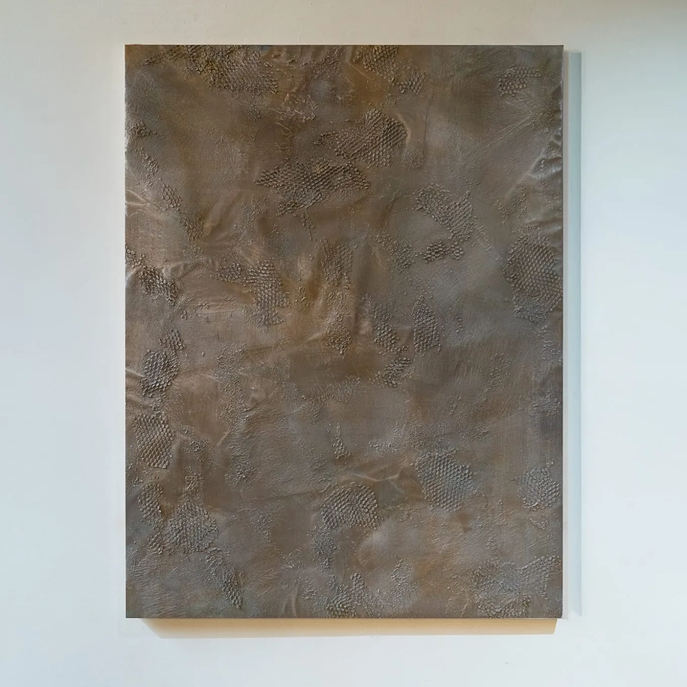 The materials of this framed paper, stucco and jute, blend on canvas to create a work that is continually fascinating and mysterious, where flashes of light emerge, caressing different textures that intrigue the eye and the touch.