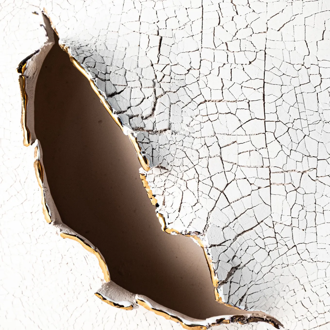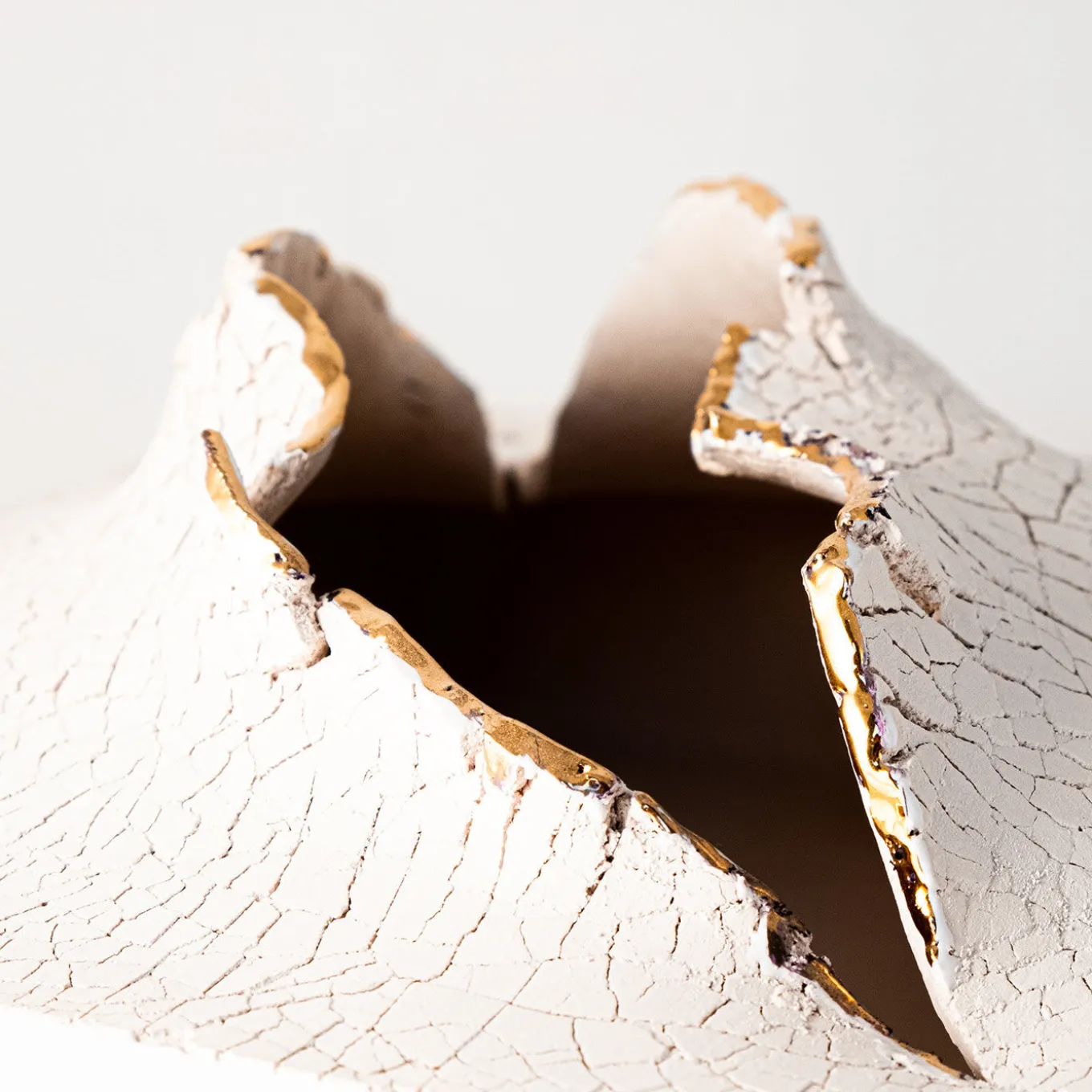 A breathtaking work of art, this ceramic sculpture belongs to the Cretto Collection. Inspired by the Earth’s natural fissures (“cretto” in Italian), this container showcases a parallelepiped shape with a finished with a white enamel glaze whose surface has been glazed with sodium silicate and fired to create an extraordinary grainy and cracked texture. Its magnificent volcanic fissure is enhanced by gold luster detail.