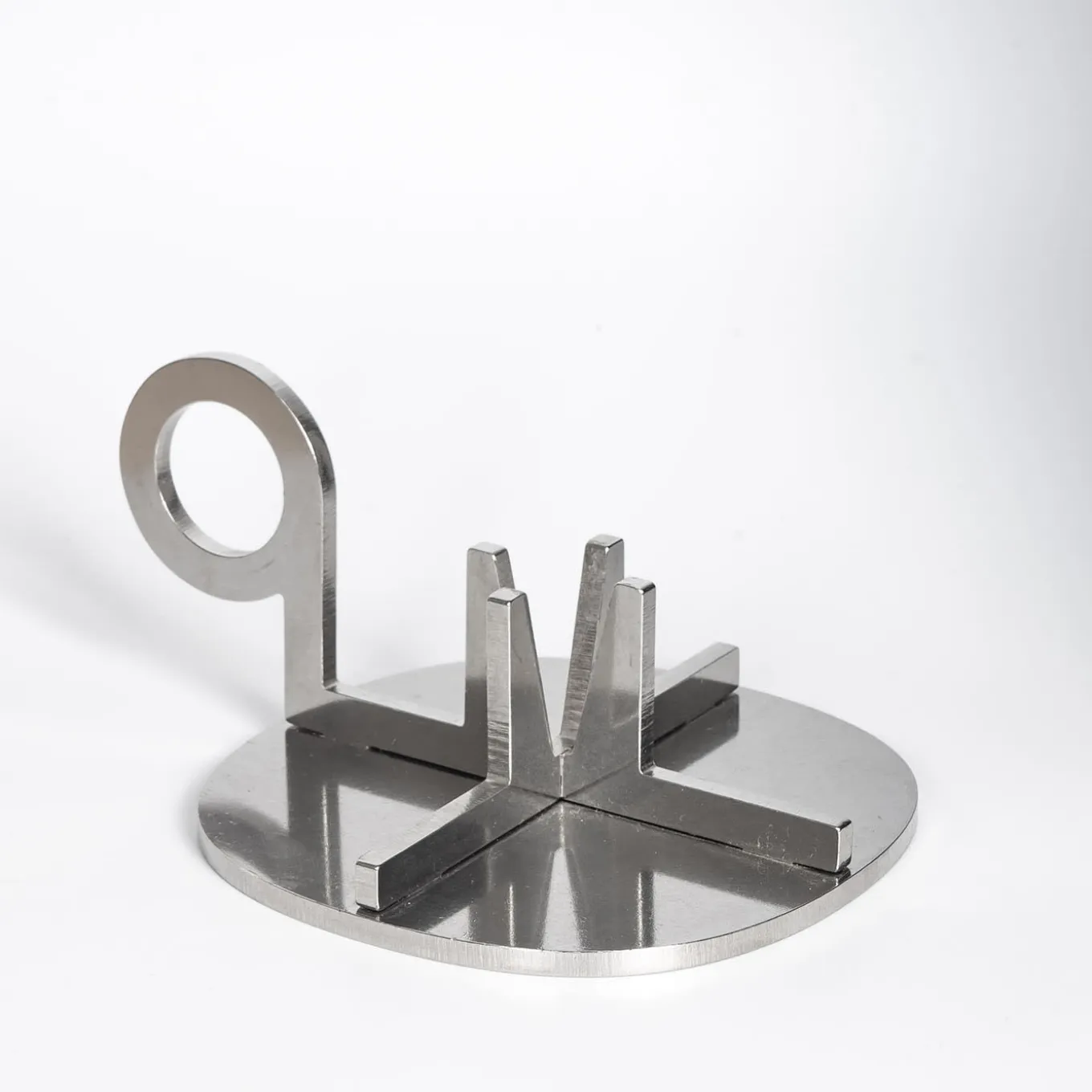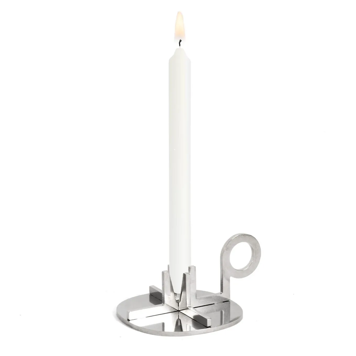 The Crocera Bugia stainless steel candle holder is made from thick stainless steel sheets cut into a sculptural form. Inspired by the mechanical details of the “Vespa-Piaggio” engine, it gets its name from this design. The surface is both shiny and textured, tumbled and polished to resemble the finish of a Vespa. The “Bugia” version is designed for easy handling.